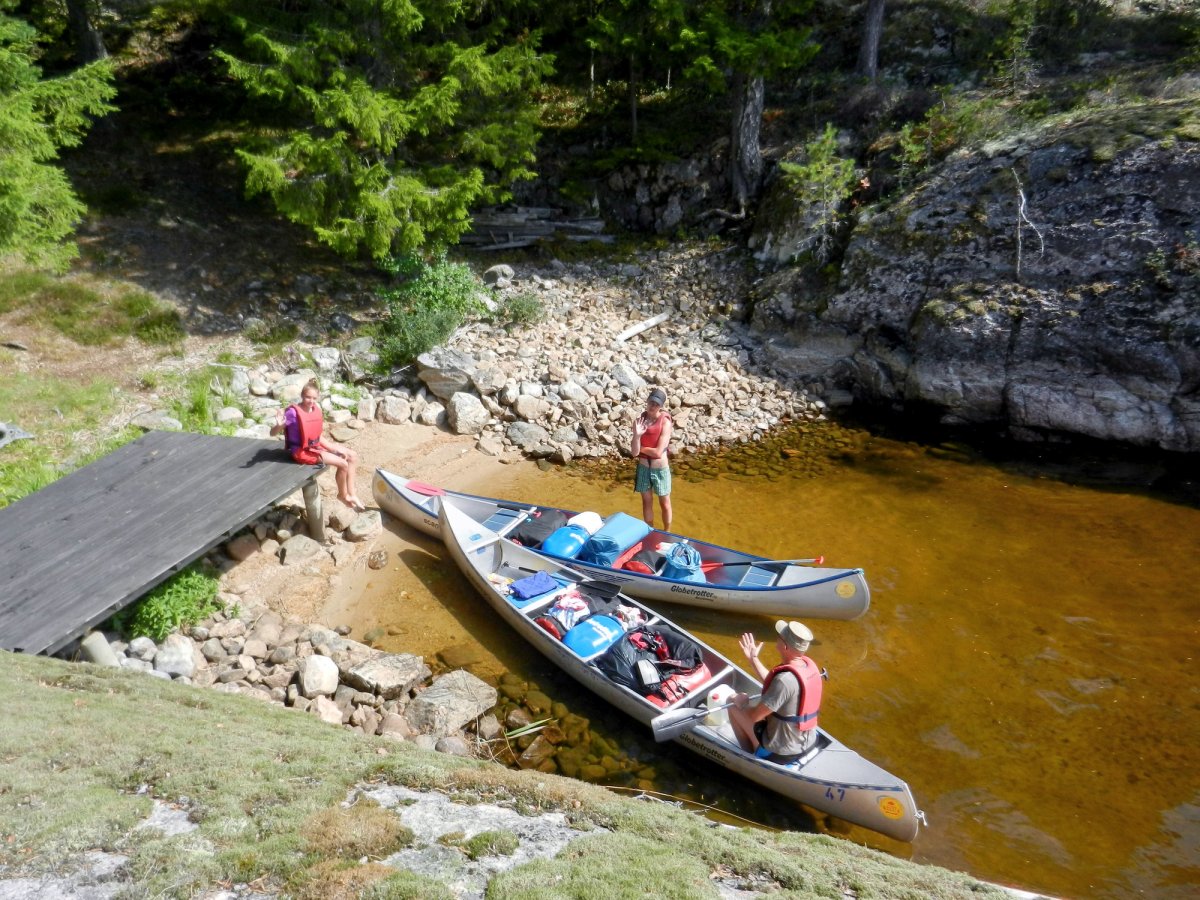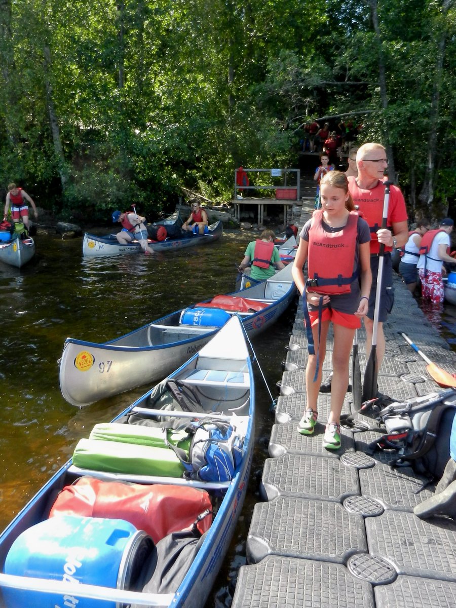 Samstag, 26.07.2014, kamen wir mit etwas Verspätung so gegen 12.30 Uhr im Camp in Lennardsfors an. 4 Reisebusse waren schon vor uns da, dementsprechend hektisch geht es bereits zu. Beim Umpacken unserer Sachen müssen wir unbedingt aus unseren langen Hosen raus- es sind gefühlte 35°C ! Auf Grund der Hitze und Trockenheit der letzten Tage herrscht absolutes Feuerverbot. Eigentlich hätten wir die Grillroste gleich im Camp lassen können, nehmen sie aber doch mit und decken uns zusätzlich mit 2 weiteren Flaschen Brennspiritus ein. Nun schnell noch zur "Paddeleinweisung", denn wir sind diesbezüglich absolute Neulinge. Am Steg herrscht Chaos, den mittlerweile kommen die ersten Heimkehrer der Vorwoche zurück ins Camp! Wir schaffen es aber ohne Kentern und andere Unfälle unsere zwei Kanus zu beladen. Gegen 15.30 Uhr ist es soweit- mit einigen beherzten Paddelschlägen sind wir auf dem Wasser. Sofort umfängt uns angenehme Ruhe und ich habe das Gefühl: " Jetzt beginnt der Urlaub!" Die Sonne brennt vom Himmel und keiner von uns hat zwischen Ankommen im Camp, Ausrüstung empfangen, Umpacken und Kanu beladen an Sonnencreme gedacht. Also machen wir nach wenigen Minuten am gegenüber liegenden Ufer einen kurzen Zwischenstop und holen dies nach. Wir sind uns einig:" Heute reißen wir keine Bäume mehr aus!" Wir paddeln auf dem Foxen Richtung Norden und halten Ausschau nach einem geeigneten Platz für 2 Zelte. Die lange Busfahrt hat uns geschlaucht, die Sonne lacht und der See läd einfach nur zum Baden ein! Nach ca. 5 km ist so ein Platz gefunden, die Kanus entladen und ab in die Fluten! Das Wasser ist erstaunlich warm! Danach verschaffen wir uns einen Überblick über den Inhalt der Verpflegungstonnen, sortieren etwas um. Wie lange wird das Frische bei diesen Temperaturen frisch bleiben? Bei jeder sich bietenden Gelegenheit müssen die Tonnen ins Wasser oder in den Schatten. Vater und Sohn kümmerten sich dann um den Zeltaufbau, wir Frauen um das Abendessen. Original Jette- Kommentar." Der erste Tag in Schweden war gar nicht mal so schlimm!" ;-)