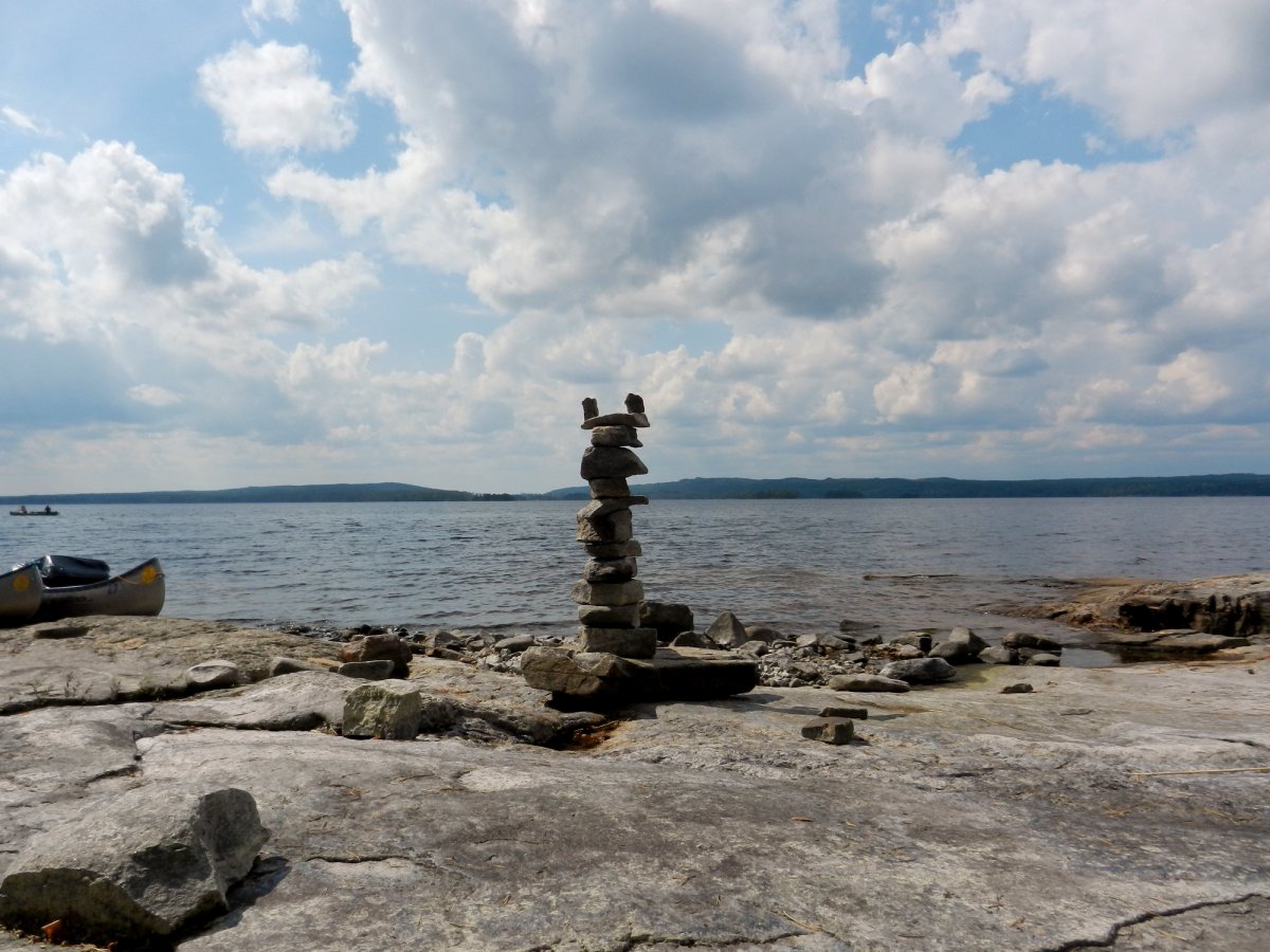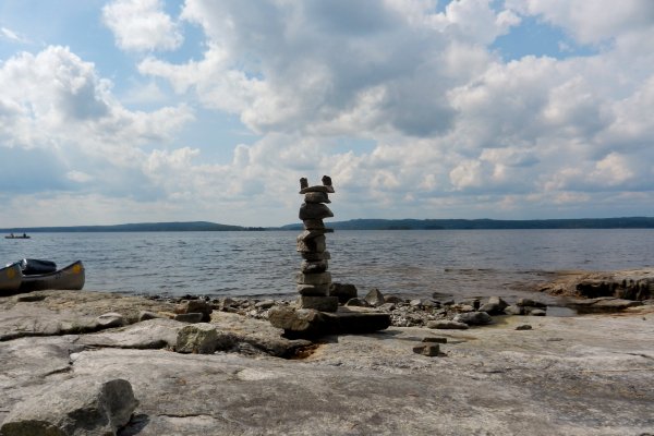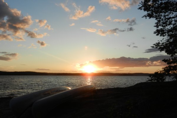 Sonntag, 27.07.2014: Wir haben tatsächlich bis 8.00 Uhr geschlafen. Dann ein erstes Bad im See- total toll zum wach werden! Nach einem gemütlichen Frühstück, dem Zusammenpacken und Beladen der Kanus ging es noch einmal ins Wasser und gegen 11.00 Uhr raus auf den Foxen. Wir hatten im Vorfeld keine Route geplant und die Standortbestimmung allein mit Karte fiel uns anfangs nicht leicht. Deshalb beschlossen wir, uns immer am rechten Ufer zu orientieren und die nächsten Tage Richtung Norden zu fahren. Das Paddeln als Mutter- Sohn- Team und Vater- Tochter- Team ging schon bald recht gut, wir kamen voran und hatten Spaß bei herrlichsten Sonnenschein.Gegen Mittag kamen wir an eine kleine flache Bucht, zur Begrüßung hatten Vorbesucher einen Steinobelisken aufgebaut. Hier gefiel es uns und wir hielten zum Mittagslunch, zum Baden und Sonnen. Im Moment des Aufbruchs bemerkte ich, wir haben die Grillroste nicht dabei! Wir hatten sie früh vergessen einzuladen! Also, zurück zu unserem ersten Übernachtungsplatz! Und obwohl nur ein kleines Lüftchen wehte merkten wir schon bald, das es bedeutend anstrengender war gegen den Wind zu fahren. Aber wir fanden "unseren" Rastplatz wieder und zum Glück lagen beide Grillroste noch da! Erst wollten wir nur kurz verschnaufen, dann entschlossen wir uns zu bleiben- ein Gewitter zog auf. Also schnell ausladen und Zelte aufbauen. Alle packten mit an und so schafften wir es im Trockenen. Nach 1,5 h Regen, Hagel und Blitzen war der Spuck vorbei und der Sonnenuntergang fantastisch.
