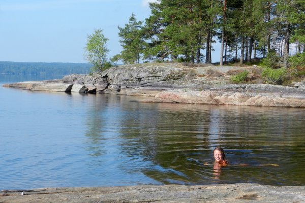 Montag, 28.07.2014: Früh waren die Zelte noch feucht, also abwarten mit dem Zusammenpacken. Wir erkundeten unsere Umgebung zu Fuß, doch schon bald brannte die Sonne wieder so heiß, das es uns ins Wasser des Foxen zog. Es war schon fast Mittag als wir mit unseren Kanus aufbrachen. Die "Ameiseninsel" war unser erstes Ziel. Wir paddelten einmal um die Insel herum, um dann an der Südspitze anzulegen. Es folgte ein kleiner Fußmarsch über die Insel, um uns von den gigantischen Ameisenhügeln selbst zu überzeugen. Wir verewigten uns im Gästebuch der Schutzhütte und verließen die Insel Längöarna Richtung Norden. Unser Ziel: die Insel Bärön und der Lagerplatz 19. Aber dort war es leider sehr voll. Also noch ein paar Paddelschläge weiter, auch wenn uns die Hitze etwas zu schaffen machte. Aber irgendwie hatten wir uns so an die Ruhe gewöhnt.