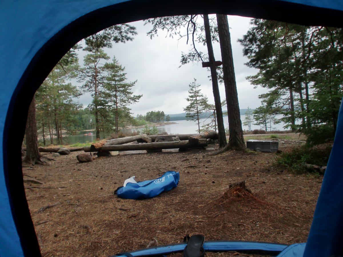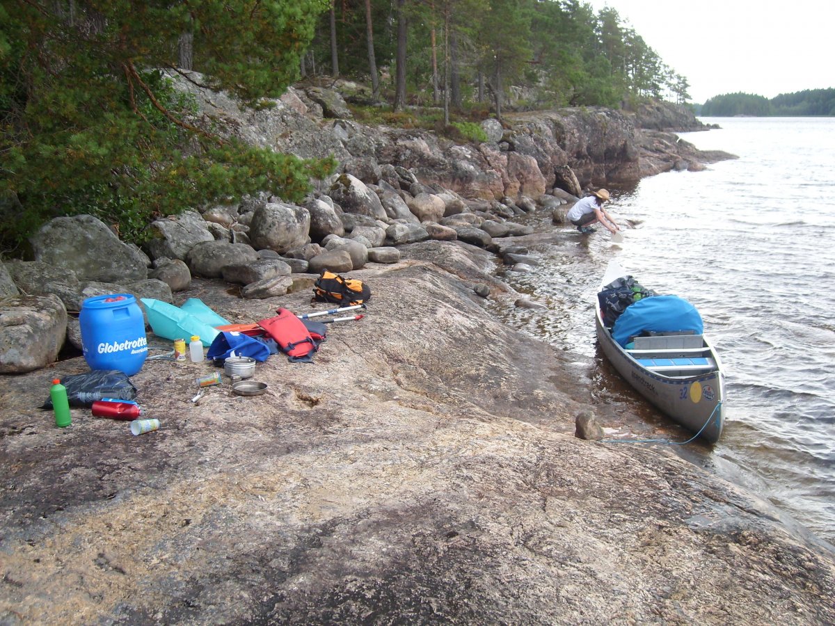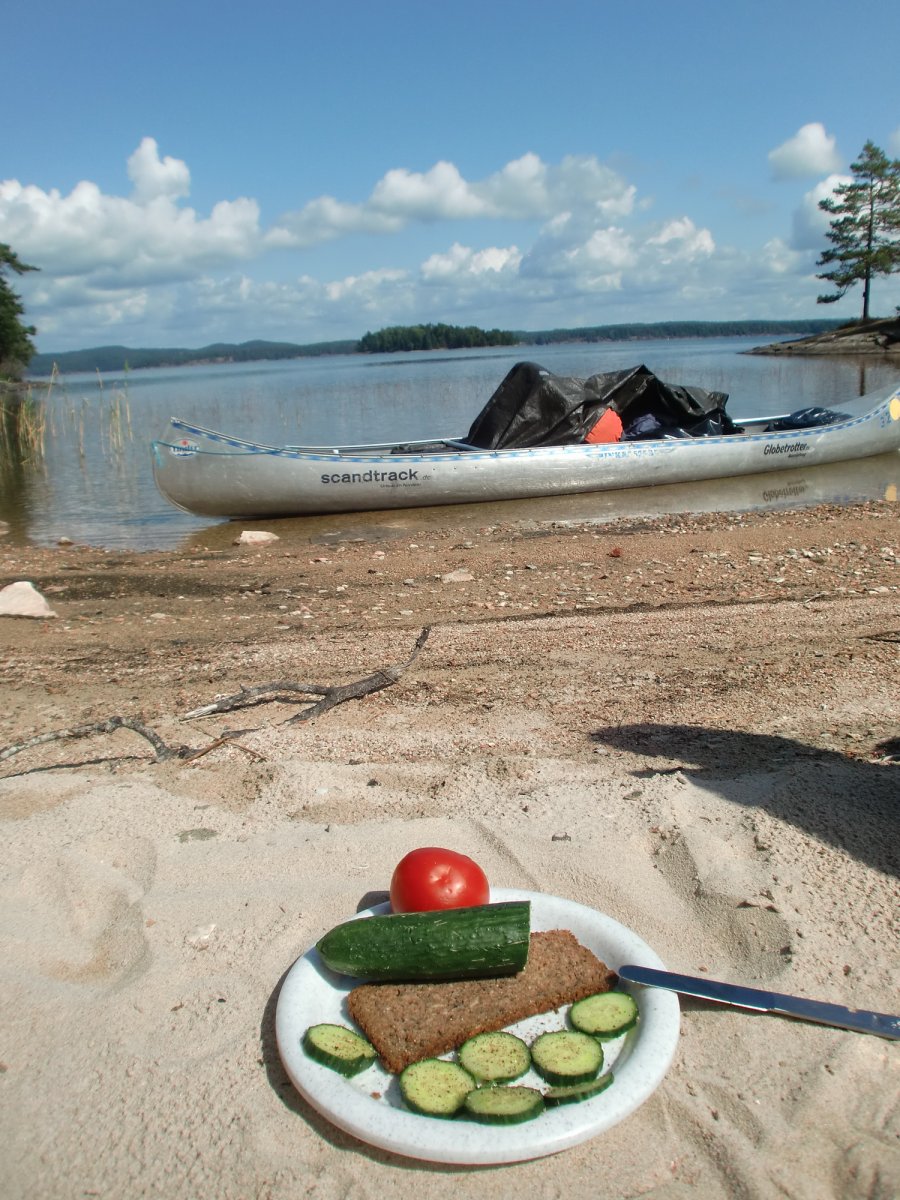 Um dem großen Ansturm zu entkommen haben wir einfach all unsere Sachen ins Kanu geladen und sind losgepaddelt. Dies stellte sich sehr bald als Fehler heraus, als es plötzlich heftig zu Gewittern anfing. Das Wetter schlug sehr schnell um und wir hatten überhaupt Schwierigkeiten bei den plötzlich doch sehr hohen Wellen schnell an Land zu kommen und dann auch noch einen passenden Platz zum Zelten zu finden. Wir wussten nicht wo sich die Plane befand und leider wurde alles in der Kiste triefnass, auch das Klopapier, was sich dadurch in kleine Flocken verwandelte. Also lieber Tüten mitbringen und alles vorher darin einpacken, vor allem die Plane ganz oben in die Kiste legen (oder noch besser im Kanu über das ganze Gepäck ausbreiten).