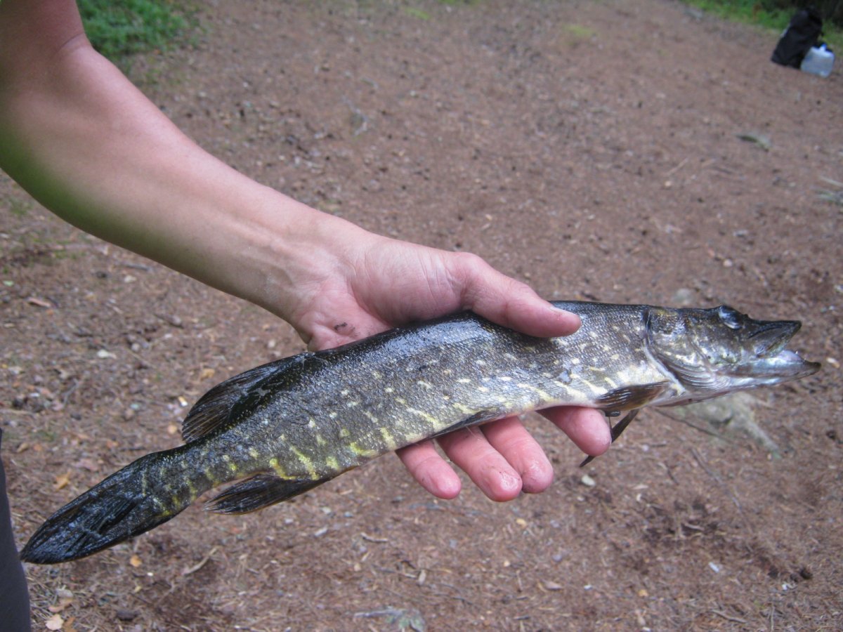 Zweite Station: Nähe Agarden. Wildromantisch im Wäldchen, gute Feuerstelle mit Holz und dem typischen Klohäuschen. Die Wäscheleine war schnell gespannt und die gefangenen Fische, Hecht und Barsche, waren schnell auf dem Feuer zubereitet. Im klaren Tidan sind abends Flusskrebse auf der Jagd. Schön, wenn es so weiter geht.
