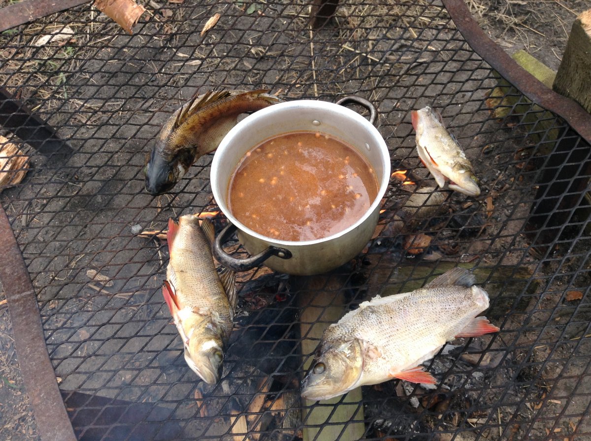 Von den vielen Fischen im Fluss landeten einige im Kochtopf bzw. auf dem heißen Stein am Lagerfeuer. Die Feldküche ist einfach, aber wirkungsvoll. Am Morgen in Wasser eingelegte Bohnen und Linsen gab es gekocht am Abend. Dazu wahlweise Reis oder Nudeln mit Pasta.