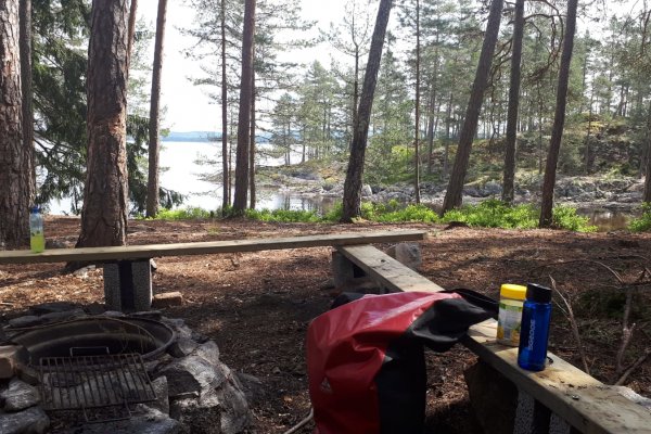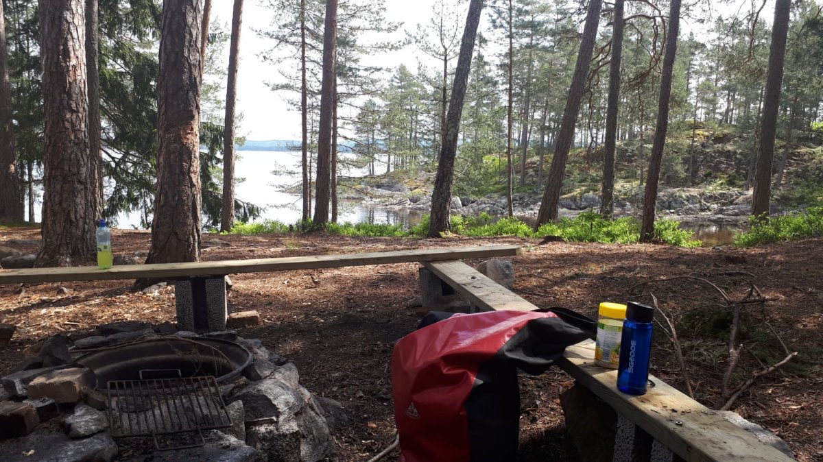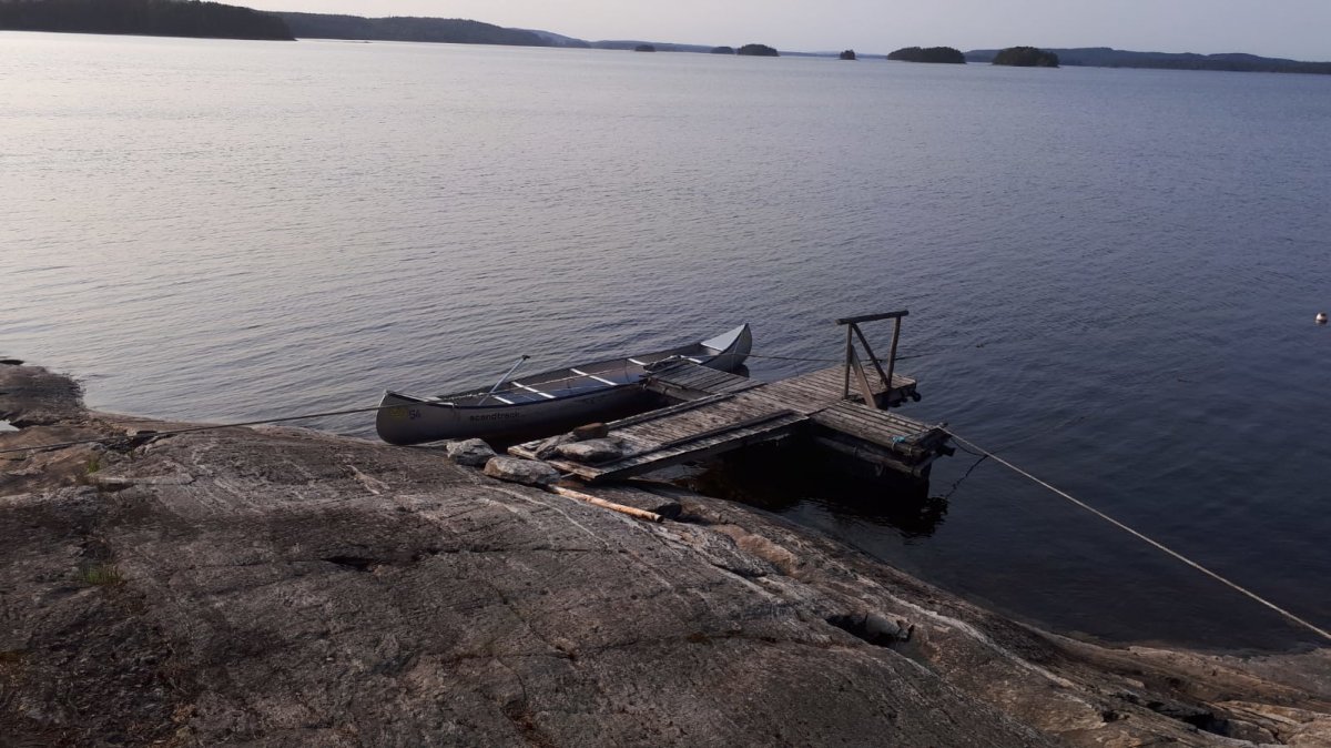Danach ging es an das Empfangen der Ausrüstung. Das hieß warten bis wir an der Reihe waren. Letztendlich war dies trotz Nieselregen und der Arbeitsteilung schnell erledigt, die Sachen waren auch schnell in wasserdichte Packsäcke umgepackt. Los ging es zu den Kanus. Schnell alles aufgeladen und los ging das Abenteuer. Anfänglich hatten wir Probleme mit der Handhabung beim paddeln. Es war für uns beide eine neue Erfahrung. Erschöpft ging es schnurstracks zur der ersten Insel. Leider war diese schon von einigen anderen Besuchern belegt und wir entschieden eine andere Insel anzusteuern. Volltreffer! Direkt an einen kleinen Sandstrand befand sich ein Danoplatz nur ohne Schutzhütte. „Egal“ sagten wir uns. Erschöpft von der langen Reise bauten wir schnell unsere Hängematten und Planen auf.