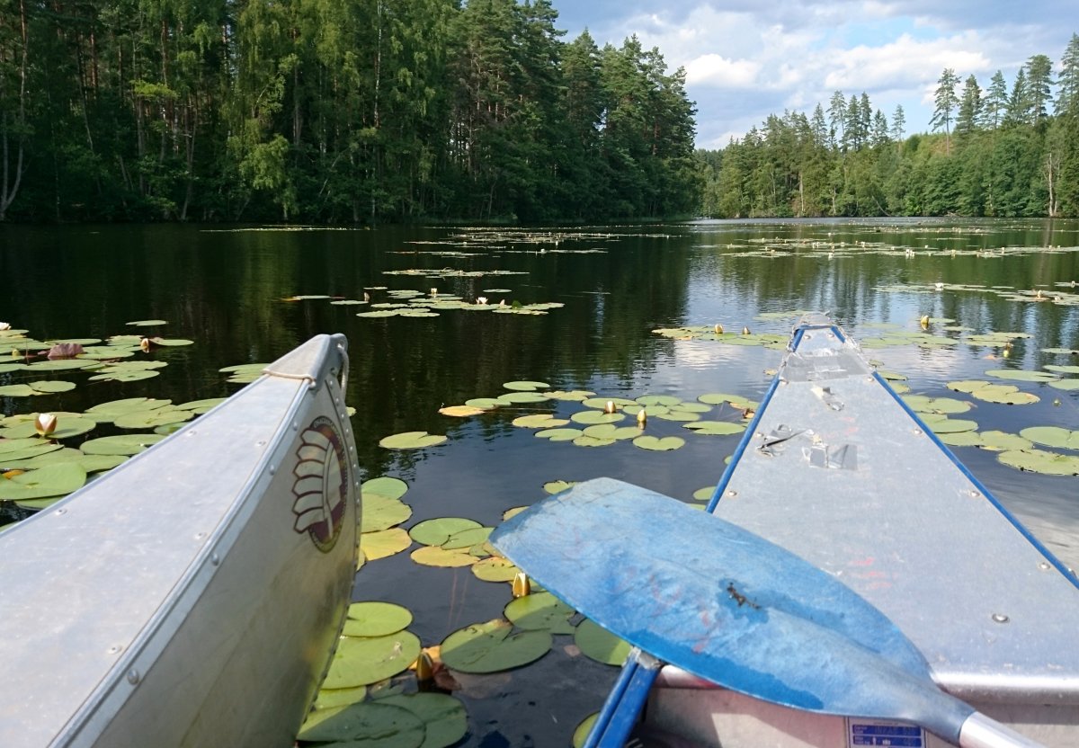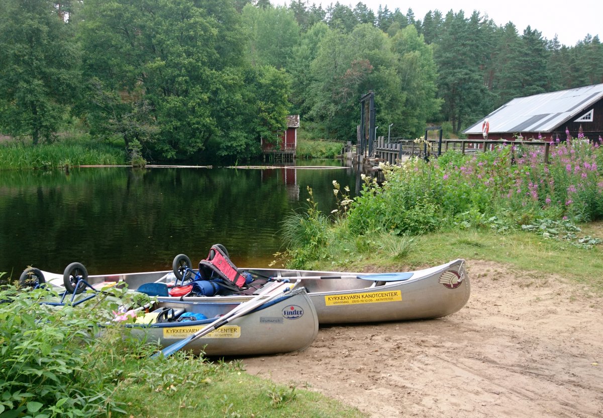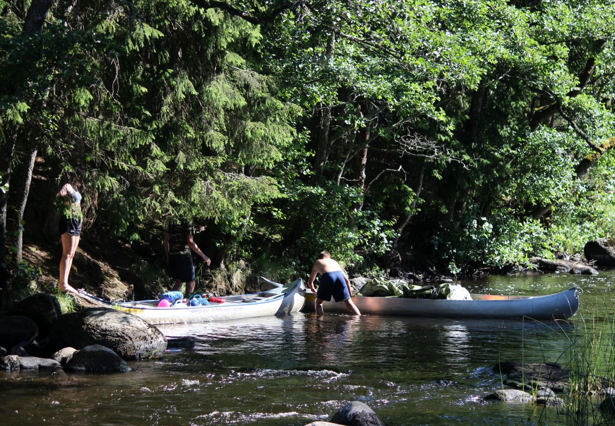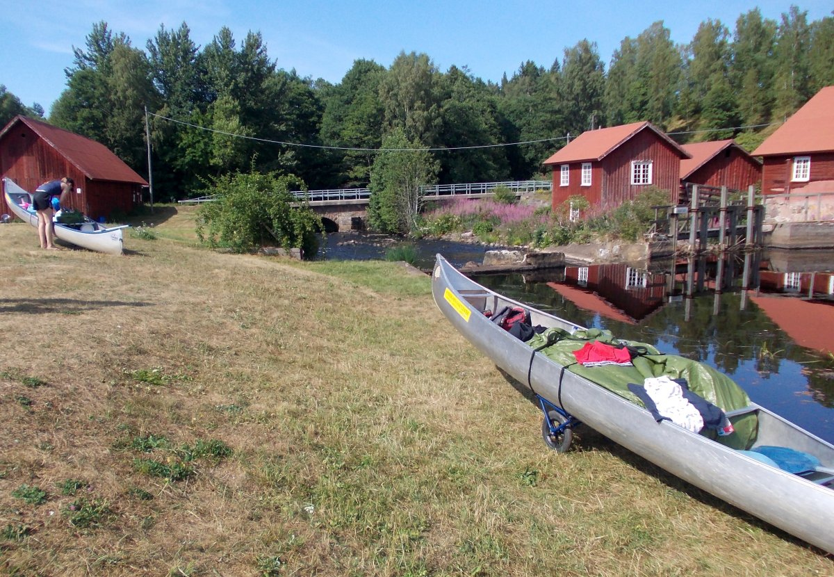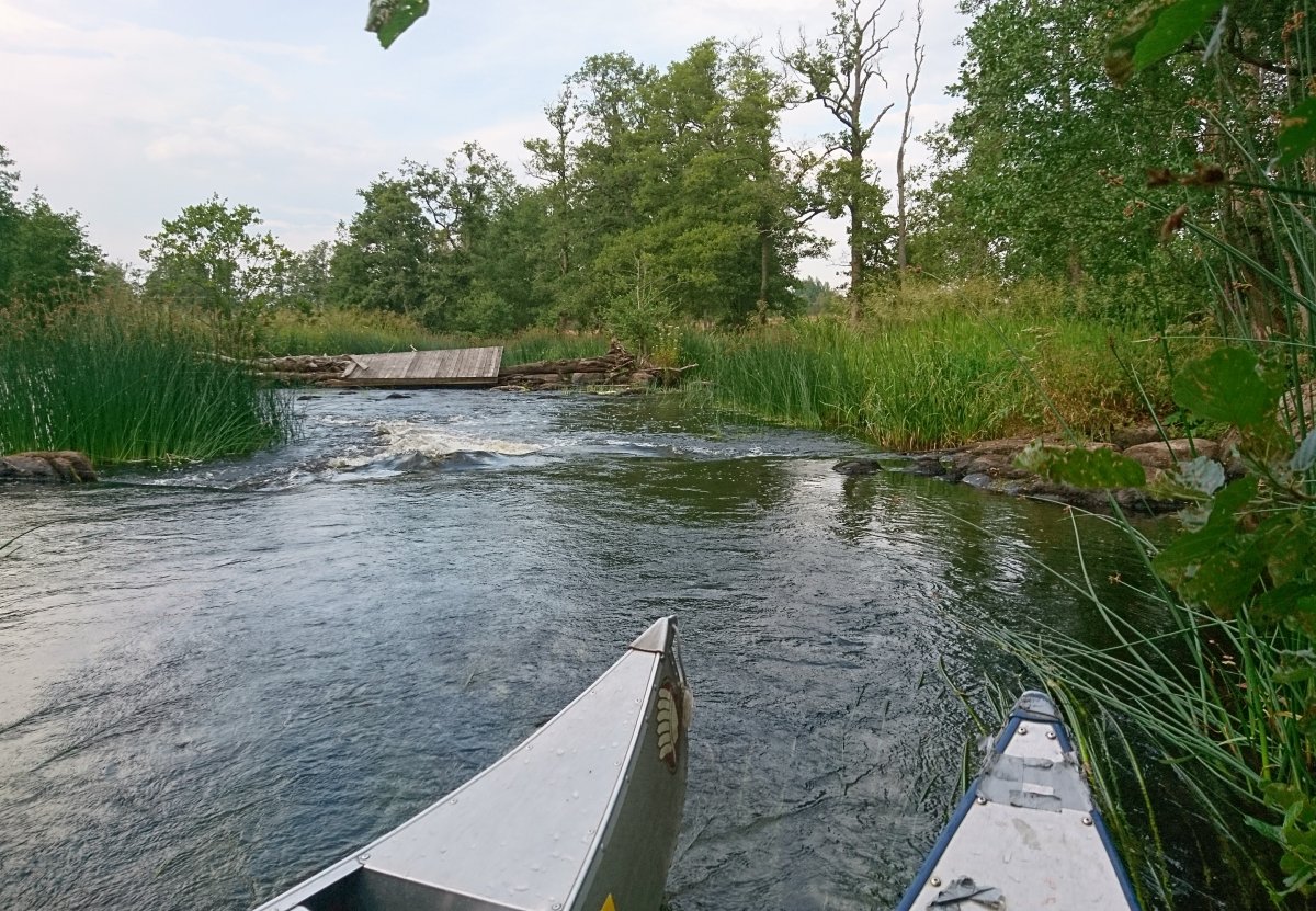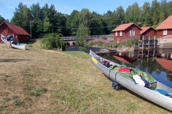 Am Abend des 12. Juli sind wir mit dem Auto von Rostock mit der Nachtfähre nach Schweden/ Trelleborg über gesetzt. Von dort haben wir uns sofort auf den Weg zum Ziel begeben, unser Abenteuer begann im Kyrkekvarns Kanotcenter in Västergötland. An der Rezeption wurden wir nicht nur einmal gefragt, ob wir die Route entlang des Tidan einschlagen wollen. Immerhin gibt es dort etliche Umtragestellen, wobei wir Strecken über Land bis zu 1.700 m bewältigen sollten. Na klar! Wir sind jung, dynamisch und hoch motiviert. Schnell haben wir unsere zwei Kanus, welche vom Veranstalter zur Verfügung gestellt worden, bestückt: Zelte, Isomatten, Schlafsäcke und jede Menge Proviant. Nachmittags tauchten wir erstmalig die Paddel in's klare Wasser und zogen beschwingt los. Nach etwa 6 km überraschte uns ein Regenschauer und wir beschlossen bei Hallaströmmen unser erstes Nachtlager aufzuschlagen. Weil wir unsere Pack-Künste nicht richtig überlegt hatten, waren einige wichtige Utensilien nass geworden. Dennoch haben wir nach dem Verzehr eines zerkochten Nudelklumpens gut geschlafen und sind am nächsten Morgen nach einem reichlichen Frühstück in den zweiten Tag gestartet. Vor Ort gab es die erste Umtragestelle, aber die Kanus waren ja leer und wir glaubten wirklich, dass sich das weiterhin so einfach gestaltet. Gemütlich und ohne Zeitdruck paddelten wir bis Bengtsvad zur nächsten Umtragestelle, die seltsamerweise eine Treppe war. Nachdem wir diese bewältigt hatten, dauerte es gar nicht lange bis Brokvarn. Dort mussten wir die Boote auf den Kanuwagen sogar schon 800 m über Land ziehen, mittlerweile haben wir uns gut eingespielt und hatten alles im Griff. Unser nächstes Ziel war der See Gimmesjön, den wir überquerten und am nördlichen Ufer unseren Platz für die Nacht vorbereiteten. Nach einem sonnigen Tag und etwa 9 zurückgelegten Kilometern gab es das erste Mal Dosenfutter. Nachts hörten wir uns unbekannte Geräusche, wahrscheinlich hat uns ein Elch ausgelacht.