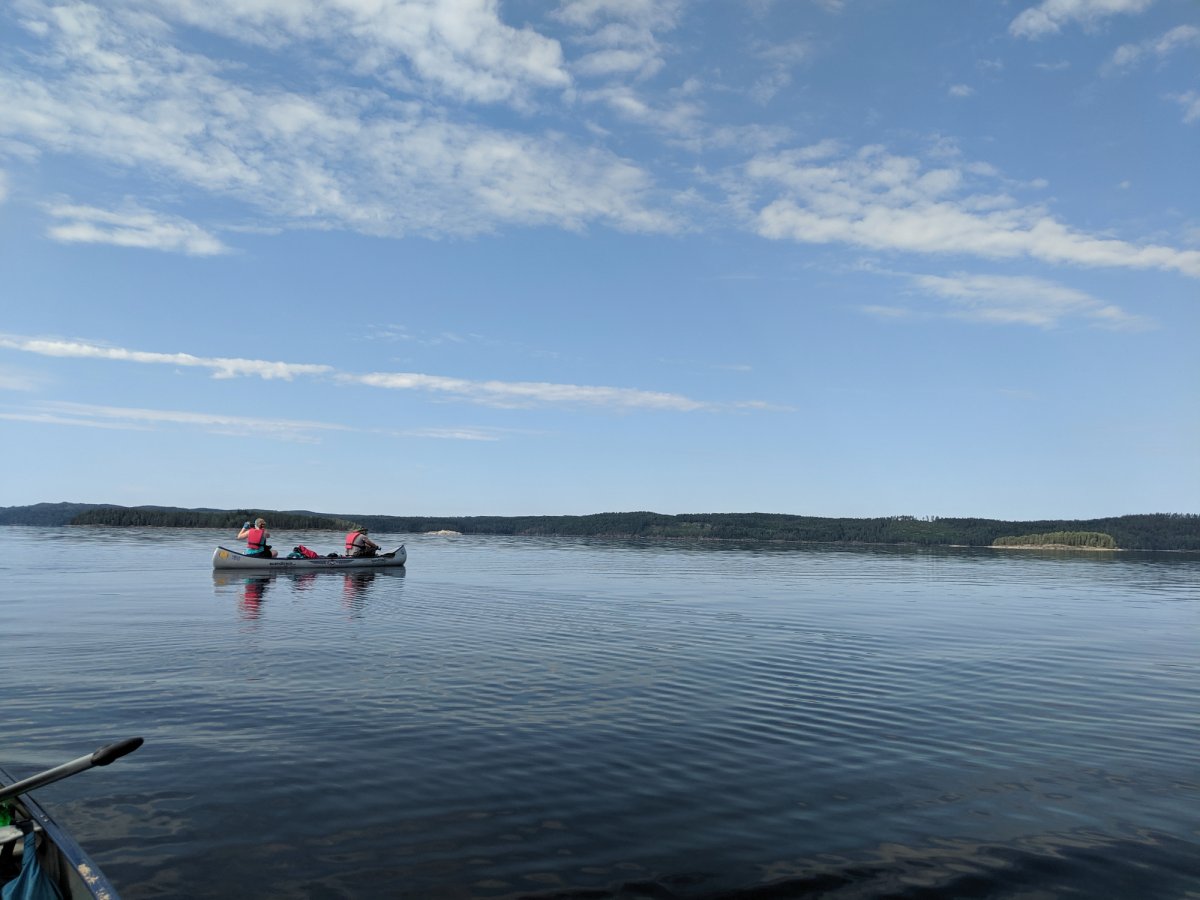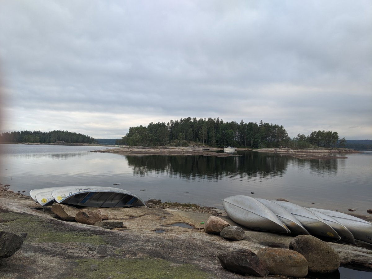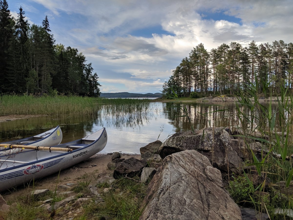 Im Basiscamp Höglund in Schweden angekommen, empfingen die Abenteurer ihre Ausrüstung, Verpflegung, Material und Kanus für die ganze Woche. Nach einer kleinen Kanueinweisung ging es direkt aufs Wasser. Nun hieß es paddeln und Ausschau nach einer Übernachtungsinsel halten. Nichts leichter als das, nach einigen Stunden auf dem Wasser erreichten alle die erste Insel. Kanus ausladen, Lebensmitteltonnen zur Feuerstelle bringen, Zelte aufbauen, Abendessen vorbereiten und Kochen auf einem Lagerfeuer, Angeln und zum ersten Mal im See Foxen schwimmen gehen stand auf der To-Do-Liste.