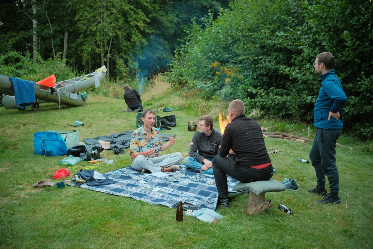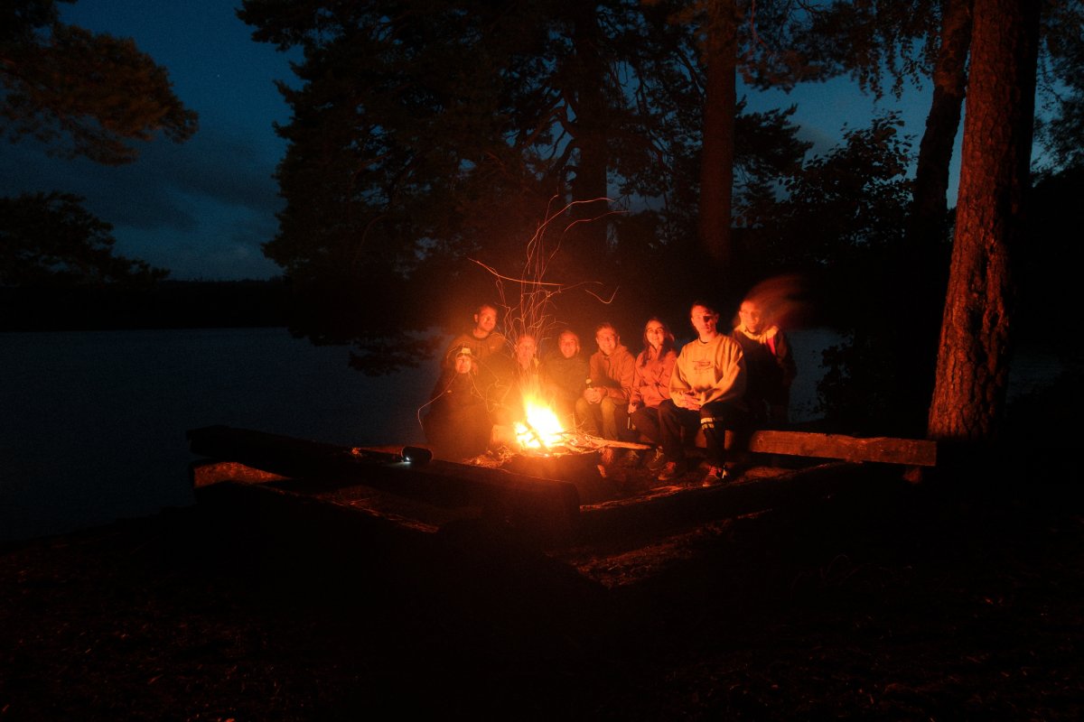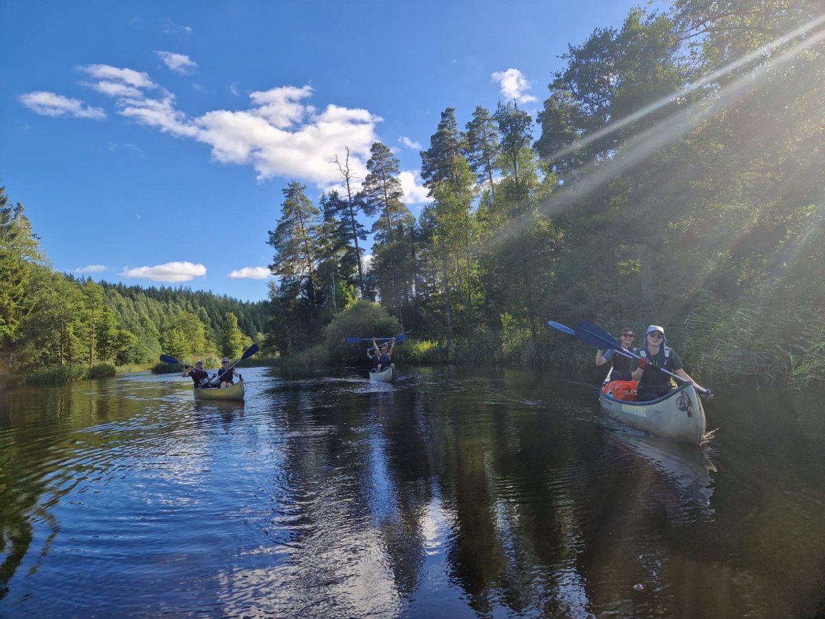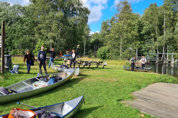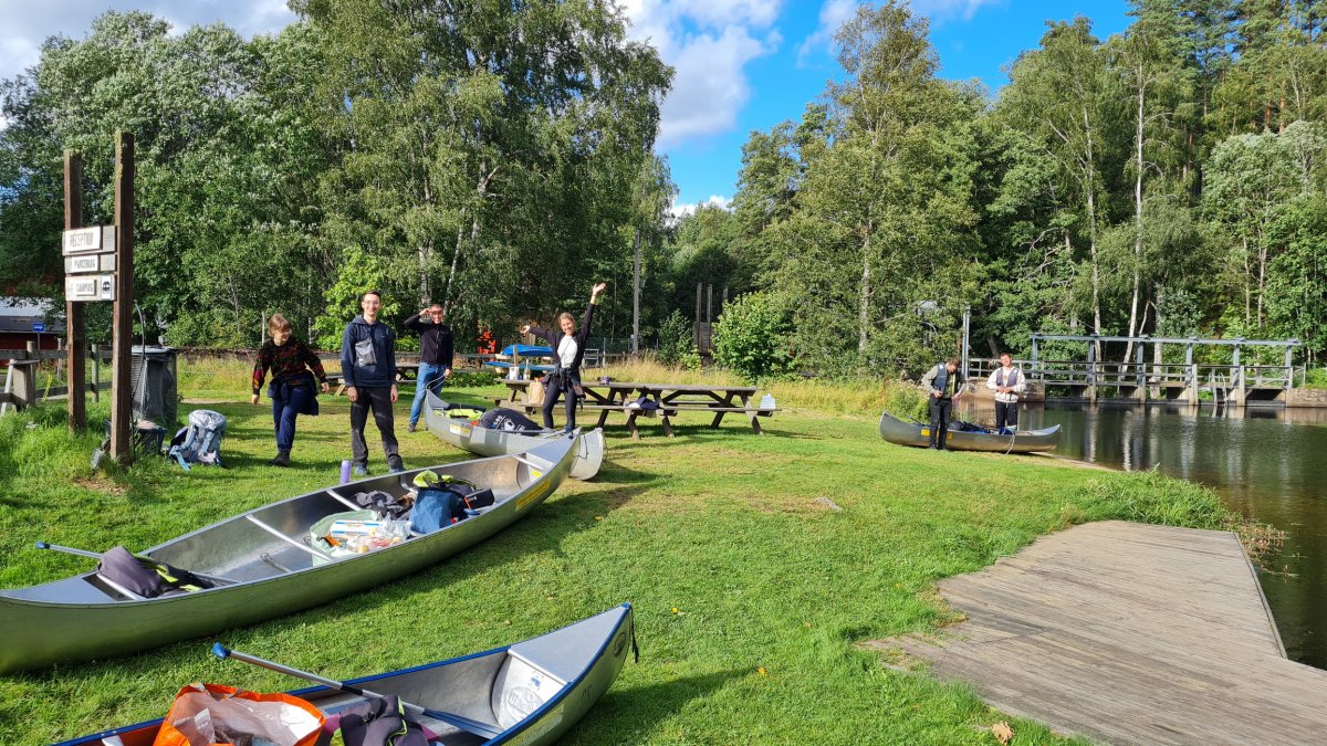 Da bei acht Leuten eine Menge an Gepäck zusammenkommt, sind drei von uns eine Woche vor unserem Tourstart mit dem Auto von Wien aus vorgefahren und haben den Großteil an Gepäck mitgenommen. Der Rest von uns flog nach. Schon bei der Zugfahrt nach Sandhem sahen wir unzählige schöne Flüsse und Seen. Spätestens da wussten wir, dass wir eine richtig schöne Zeit haben werden. Im Outdoorcamp Kyrkekvarn Cottages bekamen wir einer sehr ausführlichen Einführung von einer Mitarbeiterin. Sie markierte uns Abholstellen und Stellen, an denen besonders viel Acht gegeben werden muss und gab uns nützliche Tipps und Empfehlungen mit auf den Weg. Danach verstauten wir unsere ganze Ausrüstung in den unzähligen Kisten, Drybags und Rucksäcken, kauften alle Lebensmittel ein, die wir für die fünf Tage benötigten, und bereiteten die Kanus vor. Mit prallgefüllten Booten waren wir dann endlich bereit zu starten. Wir tasteten uns zuerst an die südliche und einfachere Seite des Tidans ran, um uns an die Kanus zu gewöhnen. Da wir spät gestartet hatten und wir am nächsten Tag die Flussseite wechseln wollten, entschieden wir uns die erste Nacht am Campingplatz am See Stråken zu verbringen. Das sollte der einzige Campingplatz werden, den wir mit anderen teilten. Danach hatten wir die Campingplätze nur für uns, was einem das Gefühl gab, auch wirklich abgeschottet von der Welt zu sein.