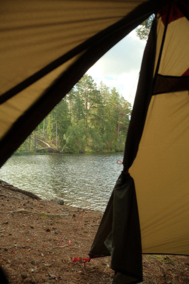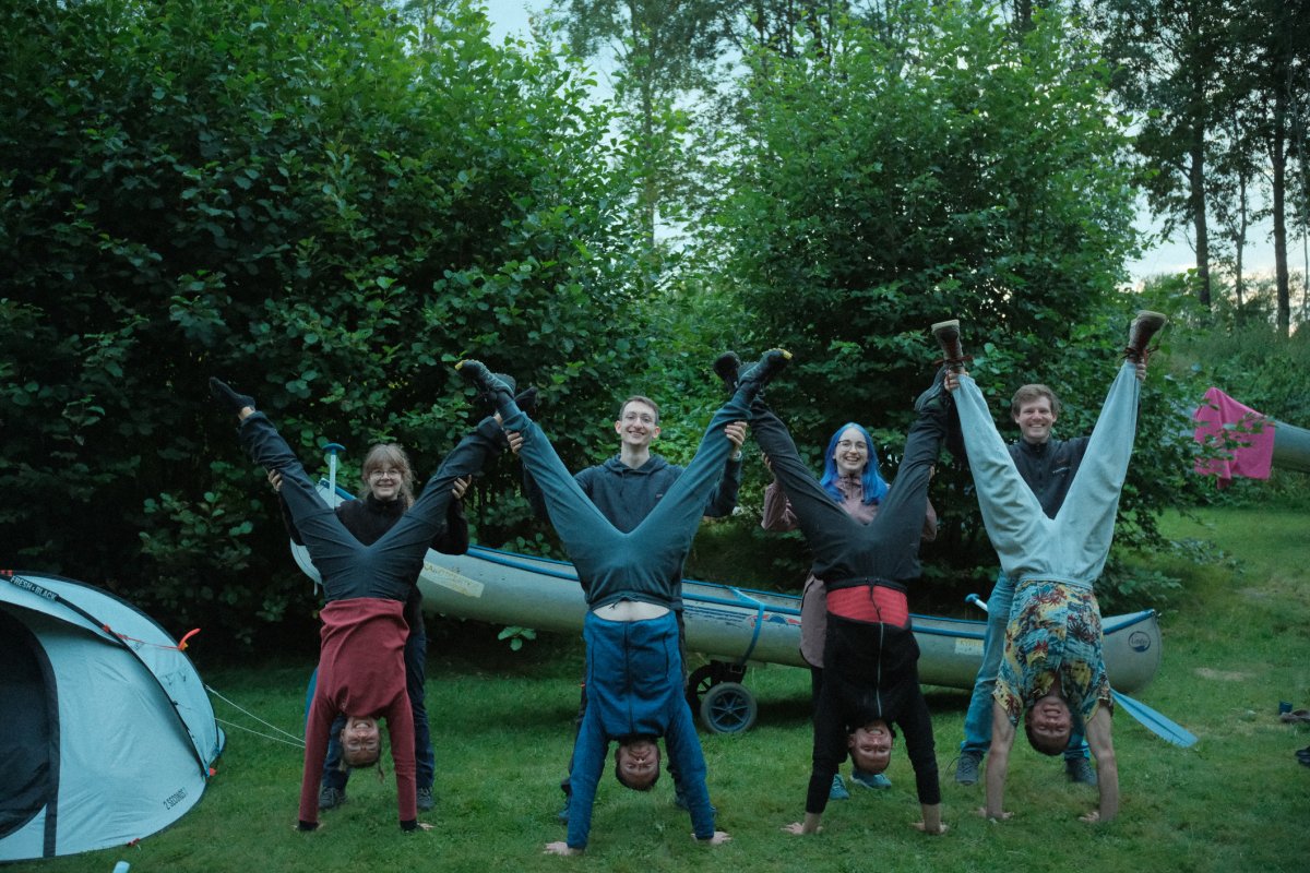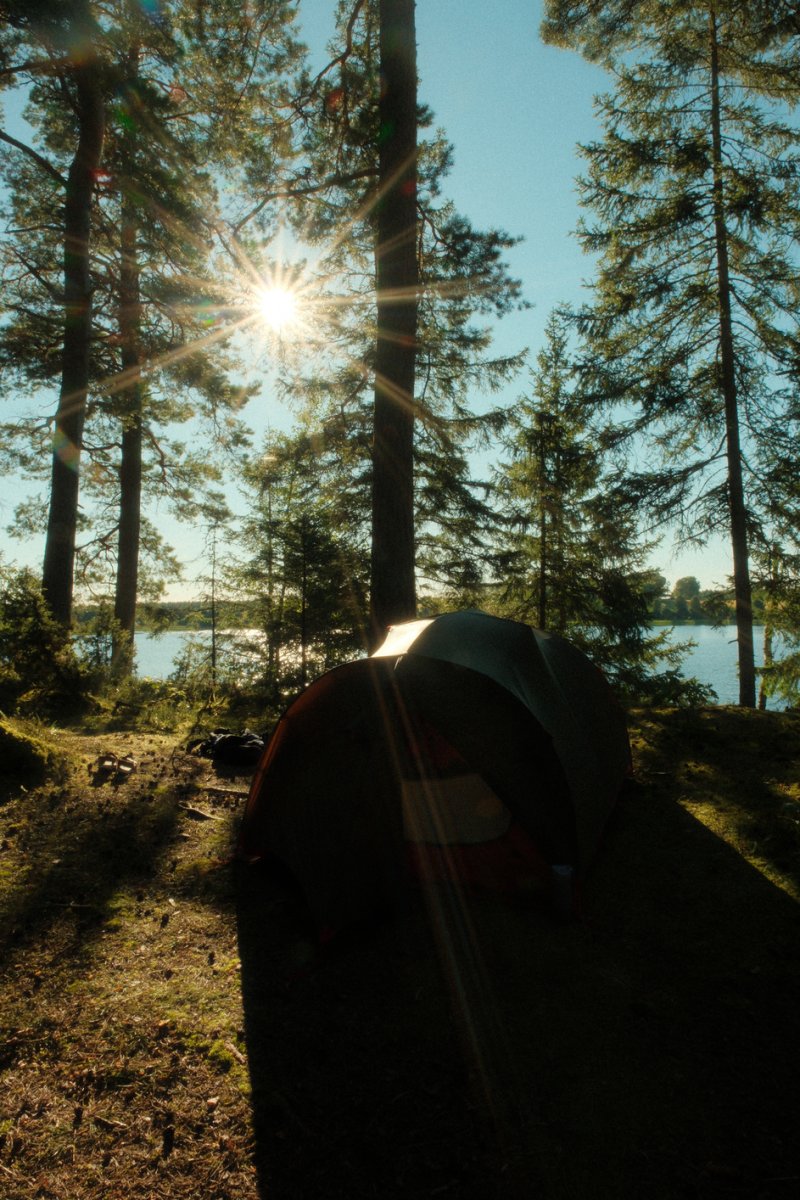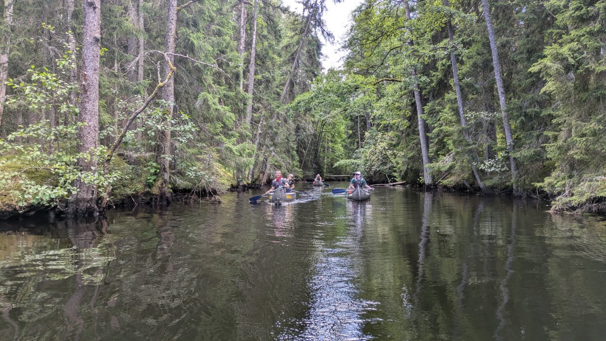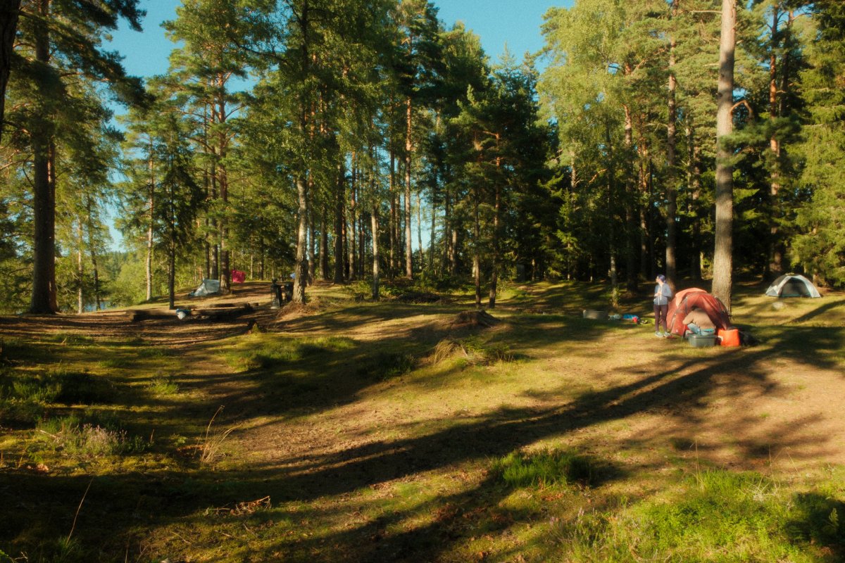 Da bei acht Leuten eine Menge an Gepäck zusammenkommt, sind drei von uns eine Woche vor unserem Tourstart mit dem Auto von Wien aus vorgefahren und haben den Großteil an Gepäck mitgenommen. Der Rest von uns flog nach. Schon bei der Zugfahrt nach Sandhem sahen wir unzählige schöne Flüsse und Seen. Spätestens da wussten wir, dass wir eine richtig schöne Zeit haben werden. Im Outdoorcamp Kyrkekvarn Cottages bekamen wir einer sehr ausführlichen Einführung von einer Mitarbeiterin. Sie markierte uns Abholstellen und Stellen, an denen besonders viel Acht gegeben werden muss und gab uns nützliche Tipps und Empfehlungen mit auf den Weg. Danach verstauten wir unsere ganze Ausrüstung in den unzähligen Kisten, Drybags und Rucksäcken, kauften alle Lebensmittel ein, die wir für die fünf Tage benötigten, und bereiteten die Kanus vor. Mit prallgefüllten Booten waren wir dann endlich bereit zu starten. Wir tasteten uns zuerst an die südliche und einfachere Seite des Tidans ran, um uns an die Kanus zu gewöhnen. Da wir spät gestartet hatten und wir am nächsten Tag die Flussseite wechseln wollten, entschieden wir uns die erste Nacht am Campingplatz am See Stråken zu verbringen. Das sollte der einzige Campingplatz werden, den wir mit anderen teilten. Danach hatten wir die Campingplätze nur für uns, was einem das Gefühl gab, auch wirklich abgeschottet von der Welt zu sein.