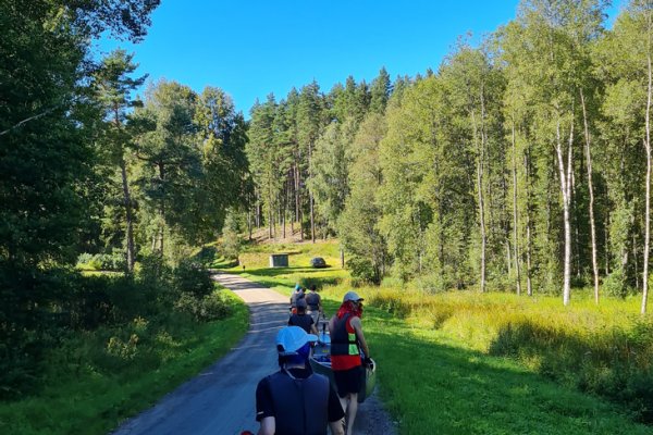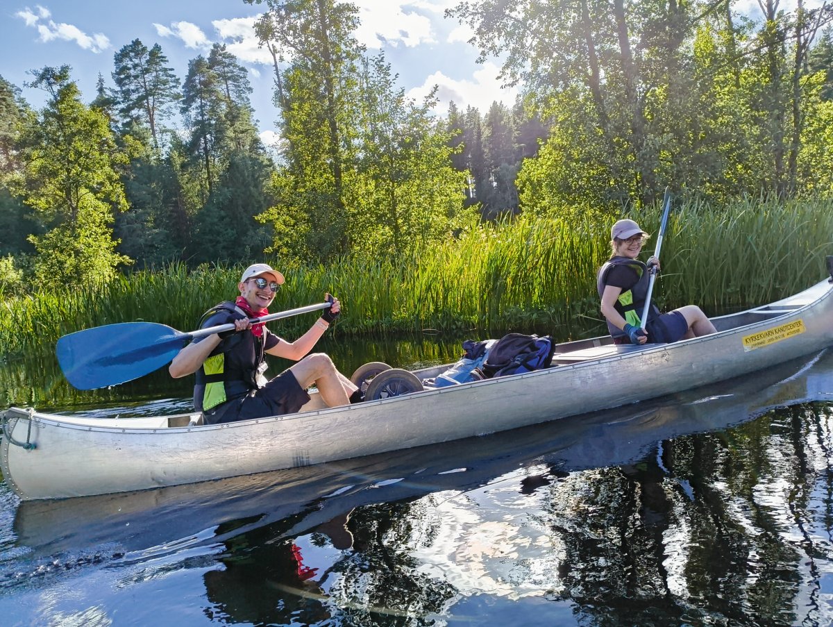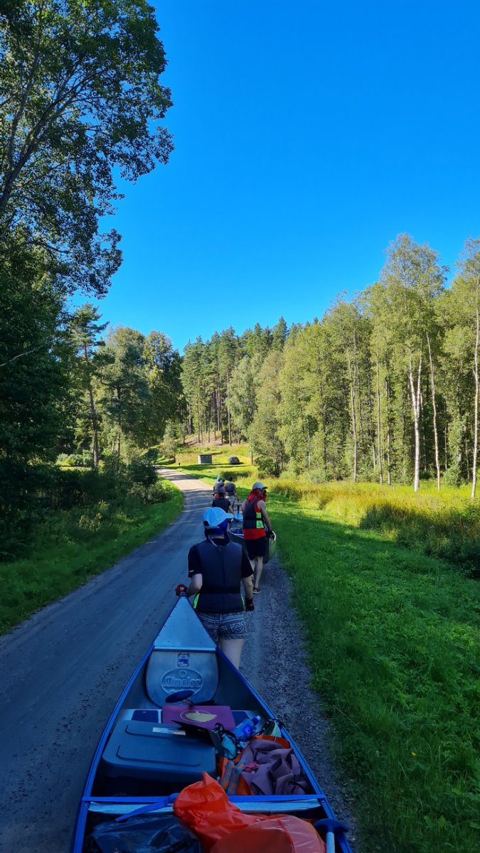 Nach einer erholsamen Nacht bauten wir unser Camp ab und paddelten wieder zum Basiscamp zurück. Wir gaben den Mitarbeitern kurz Bescheid, dass wir die Flussseite wechseln und sausten gleich weiter, jetzt aber Richtung Norden. Auf der nördlichen Seite wurden wir ziemlich schnell mit einer Challenge konfrontiert, die uns von nun an öfter begegnen sollte: Umtragestellen. Während wir gemeinsam Kanu für Kanu auf die Wagerl platzierten, konnte das aller erste Kanu nicht länger warten und machte sich kurzerhand selbständig. Es begann langsam eine kleine Neigung bergab herunterzurollen, doch Gott sei Dank kippte der Bug nach ein paar Metern nach vorne und so kam das Kanu selbst wieder zum Stillstand. Nach dem kurzen Schock und viel Gelächter trugen wir die Boote einzeln wieder ins Wasser und machten uns weiter auf den Weg zu unserem Campingplatz für die zweite Nacht in der Nähe von Svaleslättsjön.