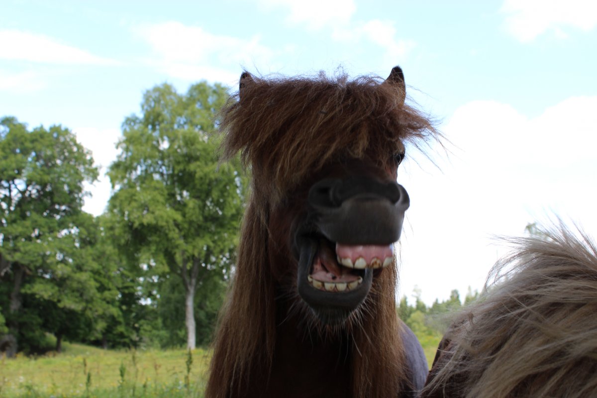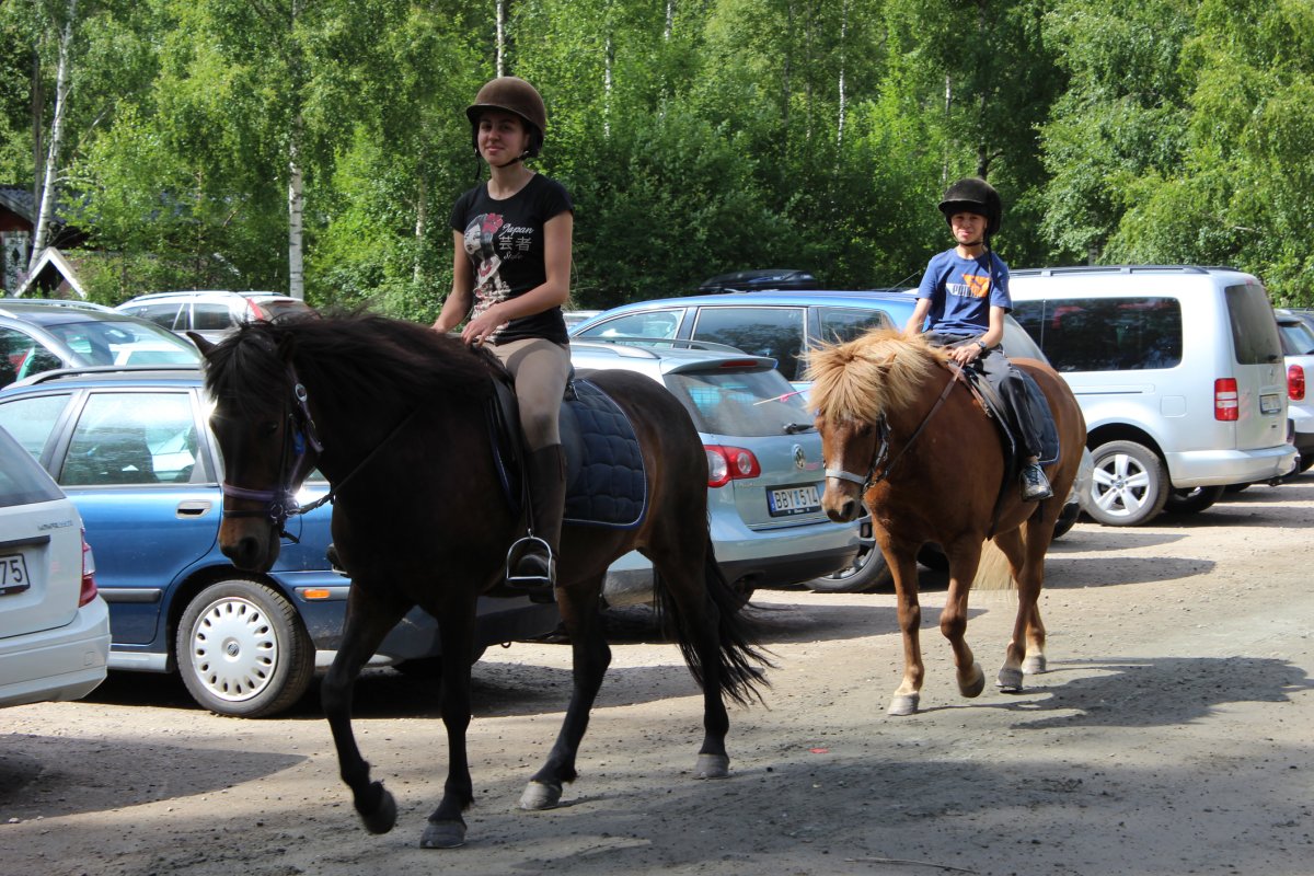 Am nächsten Morgen ging es dann gleich los. Nach halbstündiger Einweisung in die Geheimnisse des Reitens und die Besonderheiten der süßen Islandponies nahmen wir zum ersten Mal im Sattel Platz. Für jeden Reiter wurde das passende Pony ausgewählt, und schon ging’s los: Erst einmal reihten sich alle Ponies im Schritt hintereinander ein, so daß auch wir Neulinge ein Gefühl für diese Art der Fortbewegung entwickeln konnten. Auf einer Wiese gab es dann einen Crashkurs imTölten und Galoppieren und 5 min später dann die Möglichkeit, es auch auszuprobieren. Hallelujah!! Zum Glück laufen diese Ponies mit Autopilot! Lenken hätte ich nämlich nicht können – zu sehr war ich mit dem "im Sattel bleiben" beschäftigt. Meine reiterfahrene Tochter amüsierte sich natürlich köstlich über unsere verkrampften Versuche. Wieder im Schritt konnten wir dann die Reitwege durch Wald und Feld, teilweise am Fluß entlang, genießen. Nach 1,5 Stunden kehrten wir zum Stall zurück – um eine Erfahrung und schmerzende Körperstellen reicher. Die verbleibenden Reitstunden übertrugen wir dann auf unsere Kinder, die so fast jeden Tag auf Tour gingen, manchmal gab es sogar zwischendurch eine Rast mit Sandwiches, Keksen und Getränken. Auf dem Pferderücken waren sie die glücklichsten Kinder der Welt!