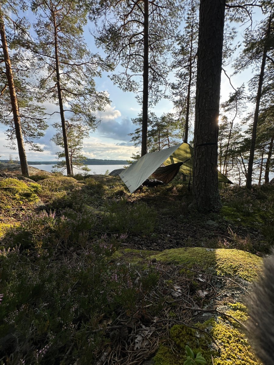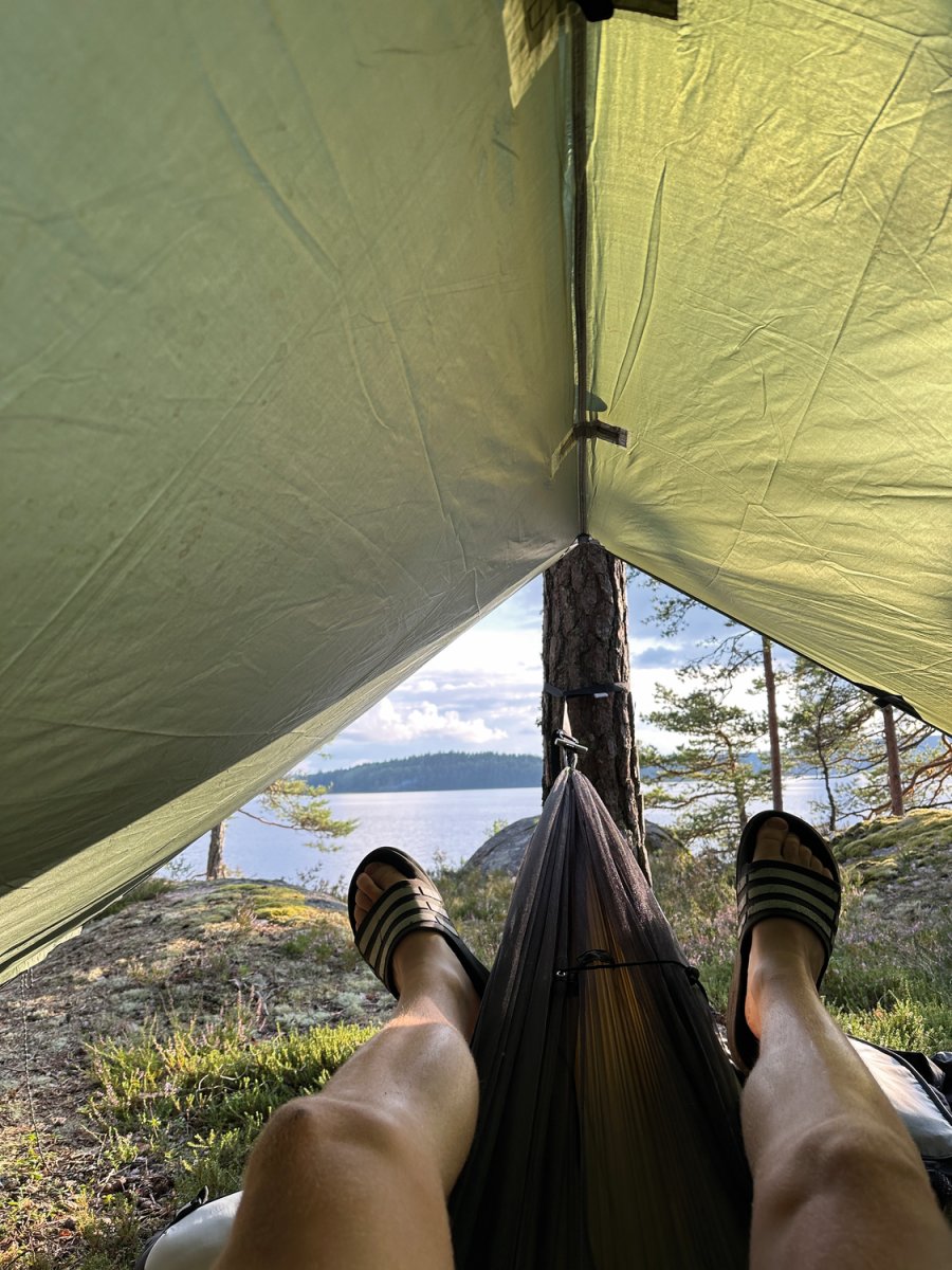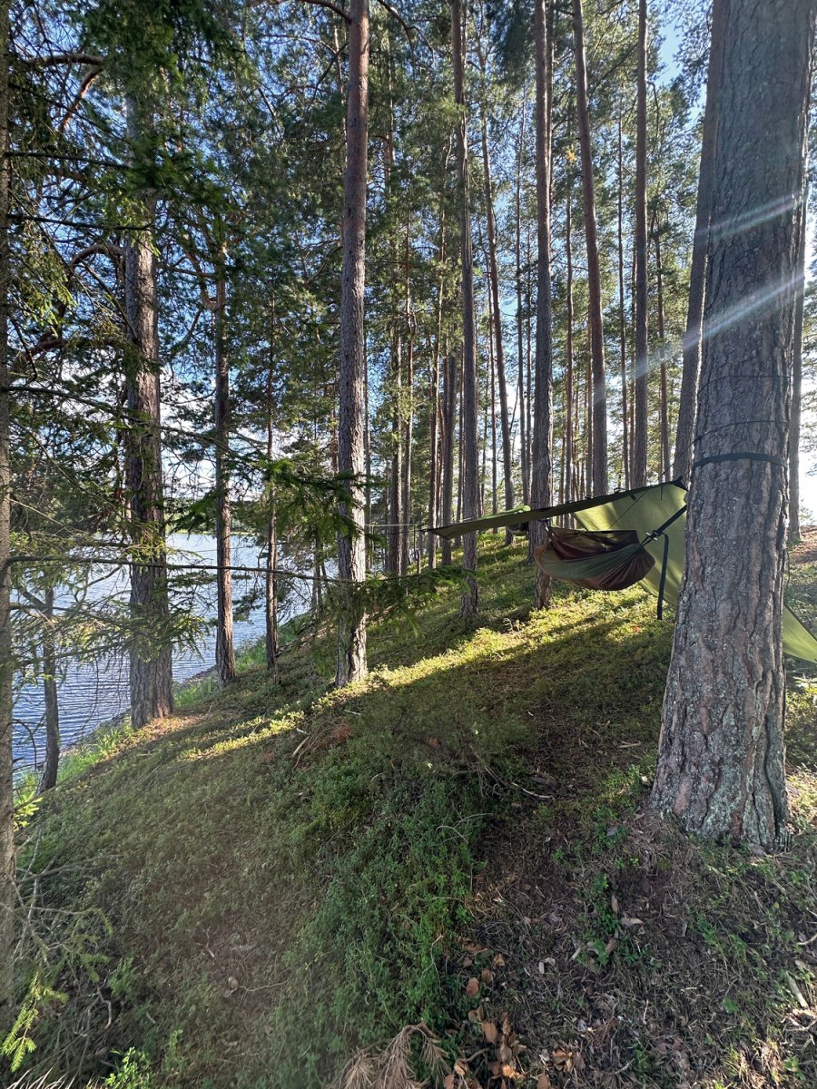 Doch das Wetter blieb nicht durchgehend so gnädig. Am Ende der Woche wurden wir von zwei unerwarteten Regentagen überrascht, die uns jedoch nicht die Laune verdarben. Im Gegenteil: Wir fanden Freude daran, die Zeit in unseren Hängematten zu verbringen, eingekuschelt in den Schlafsäcken. Während der Regen sanft auf das Tarp trommelte, quatschten wir, planten die nächsten Tage und ließen das Erlebte auf uns wirken. Die Regenschauer verwandelten die Landschaft in eine noch mystischere Kulisse, und wir schätzten die Entschleunigung, die uns die Natur bot. Mit einer Tasse heißem Kaffee in der Hand beobachteten wir, wie die Tropfen vom Tarp plätscherten und die umliegende Vegetation in einen dichten, grünen Schleier hüllten.