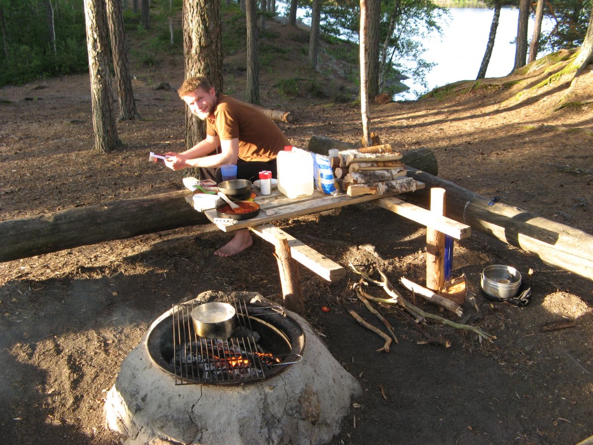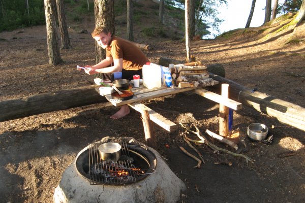 15.07.2014 Leider war das Wetter sehr ungemütlich, sodass Herr M. und Frau A. leider vorerst ihren Rastplatz nicht abbauen konnten und verbrachten den Tag im Zelt beim Lesen oder unterm Tarp mit Schnitzen. Zum späten Nachmittag wurde der Wind weniger und weil die Beiden gerne noch mehrere Standorte auf ihrer Tour sehen wollten, bauten sie ihr Camp ab und schoben ihr Kanu ins Wasser. Auf der Mitte des Sees angekommen ergossen sich alle Wolken auf Herr M. und Frau A..Kurze Zeit später erreichten sie die nächste Insel, bauten Ihr Camp auf und trockneten ihre Sachen. Danach wurden sie von zwei Besuchern der Insel begrüßt, sie tauschten die ersten Erfahrungen aus und erhielten zur Stärkung frisch gebackene Brötchen mit getrockneten Tomaten. Diese Besucher hatten die Insel aufgrund des Wetters seit gestern nicht verlassen und feuerten den gebauten Ofen auf der Feuerstelle den ganzen Tag an, so hatte der Ofen abends die perfekte Temperatur zum backen. Da Herr M. und Frau A. bereits nass waren, nutzen Sie dieses zur Köperwäsche und gingen in den Stora Le. Frisch gebadet zündete Frau A. das Feuer an, schnitt Kartoffeln und Zwiebeln. Leider war die Pfanne recht klein, so dass die Hellewittkartoffeln in drei Etappen gebraten werden mussten.