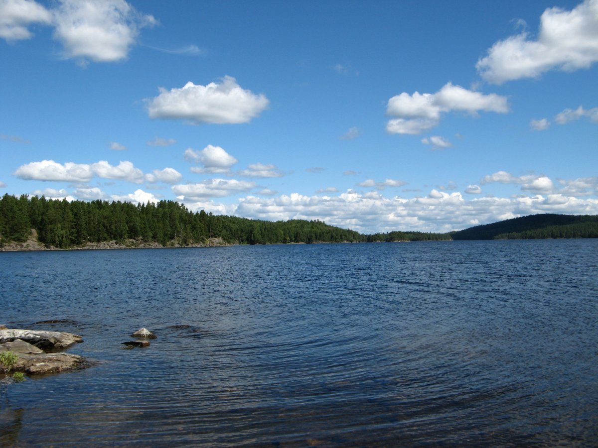 13.07.2014: Nach dem Frühstück wurde die Schlafstätte abgebaut und alles wieder in das Kanu verstaut. Es ging zurück nach L., weil die Isomatte von Frau A. gefunden wurde und sie lieber auf ihrer selbstaufblasenden schlafen wollte. Aufgrund des Wetters mussten die beiden ca. 1km. vor dem Basiscamp notgedrungen einen Zwischenstopp machen, weil die Wellen und der Wind zu stark waren. Sie bauten provisorisch schnell ein Tarp mit der Plane und einem Stock um sich vor dem Regen zu schützen. Kurz darauf machten Herr M. und Frau A. Bekanntschaft mit einem Schweden. Es stellte sich heraus, dass dieser dachte, sie wollten dort für die Nacht campen, aber als mit Händen und Füßen erklärt wurde, dass sie nur die Schauer abwarten wollen würden und danach sein Grundstück wieder verlassen, duldete er dies. Nachdem das Unwetter verzogen war, holten die Beiden die Isomatte ab und fuhren den Foxen See wieder gen Norden. Sie machten eine kurze Mittagspause an Land, aßen geschmierte Brote und Frau A. sammelte Blaubeeren. Nach einer kurzen Stärkung bogen Sie nach Süden auf den Stora Le ab. Die erste schöne Insel mit einer Feuerstelle wurde zum nächtlichen Unterschlupf auserkoren. Das abendliche Schwimmen dufte nicht fehlen.