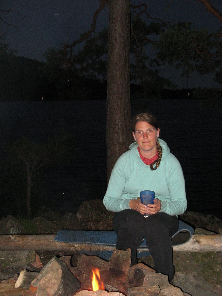 16.07.2014 Leider Herr M. und Frau A. die zum Rotwein gegessene Schokolade auf einer Bank liegen gelassen, so dass diese morgens einige Meter entfernt vorgefunden wurde. Zunächst wurde auf einen Elch spekuliert, aber die Zwei, die bereits die Insel bewohnten, erklärten, dass es wahrscheinlicher Eichhörnchen gewesen sein könnten. Nach kurzer Fahrt nach Norwegen steuerten Herr M. und Frau A. weiter den Süden des Stora Le an. Sie machten eine Mittagsrast mit Kartoffelsalat auf einer sehr überfüllten Insel und hofften auf einen einsameren Schlafplatz. Leider wurden Sie enttäuscht, auch die Insel, die sie sich zum Übernachten ausgesucht hatten, waren bereits stark besiedelt. Sie um kreisten die Insel und fanden noch einen kleinen einsamen Platz. Nachdem das Camp aufgebaut war, sammelte Herr M. Feuerholz und Frau A. Blaubeeren. Sie ging danach noch schwimmen. Als alle Aufgaben erledigt waren, überkam Herrn M. starke Kopfschmerzen, er hatte sich, trotz Sonnenhut, einen Sonnenstich geholt. So holte Frau A. für Herrn M. den Schlafsack und die Isomatte aus dem Zelt, damit er sich am Feuer erholen konnte. Sie kochte für sich und las etwas. Nachdem es zu dunkel wurde, losch sie das Feuer und Herr M. konnte sich erholen und ausschlafen.