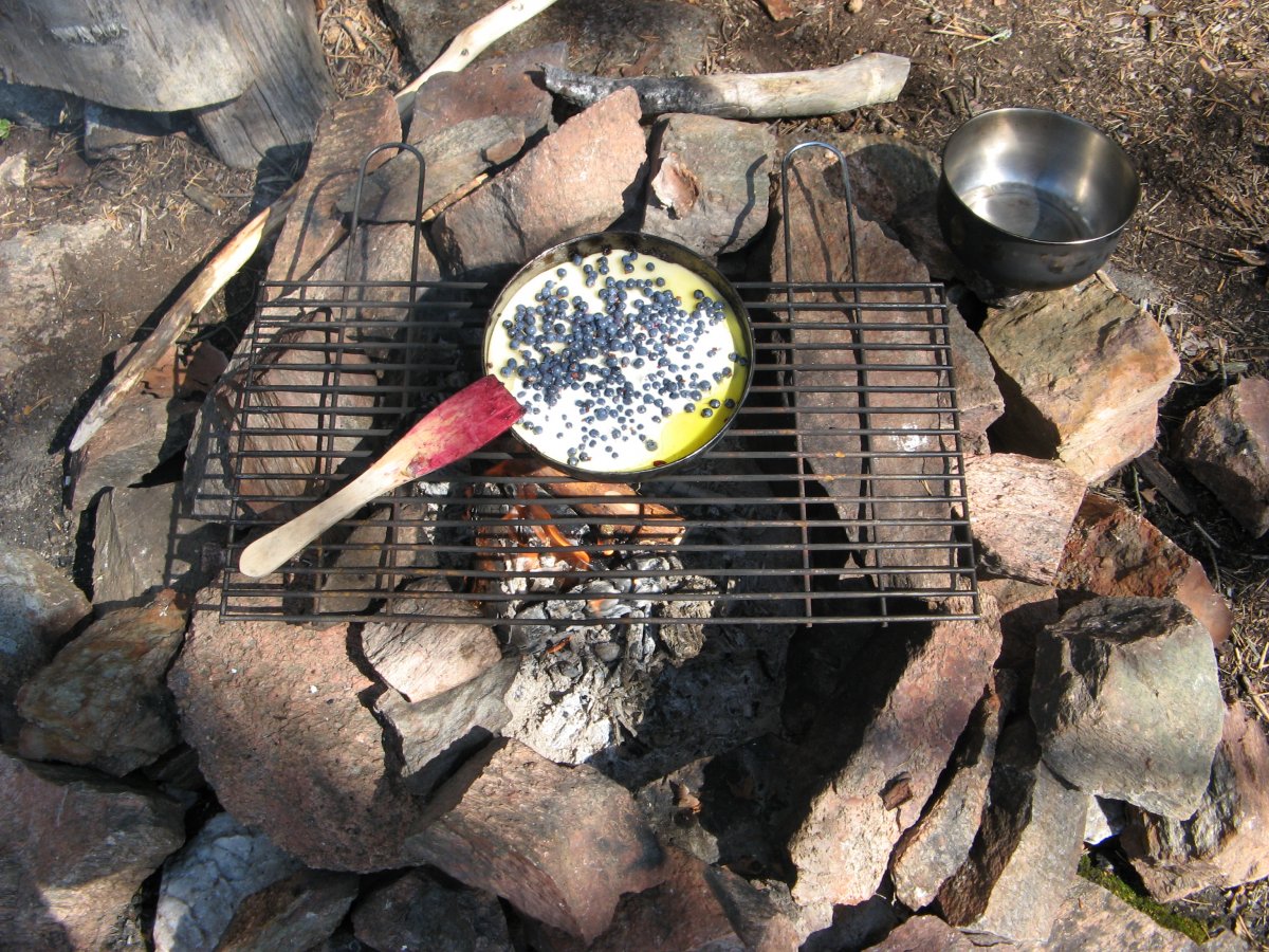 Essen: Cornflakes mit Zucker und Milch (Milchpulver und Wasser im Plastikbehälter schütteln), Brot mit Nutella, Schmelzkäse und Bohnenpaste, Pancakes mit Blaubeeren, Äpfel; Pilzreis mit Pilzen, Folienkartoffeln (eingewickelt in Alufolie in die Glut geben)