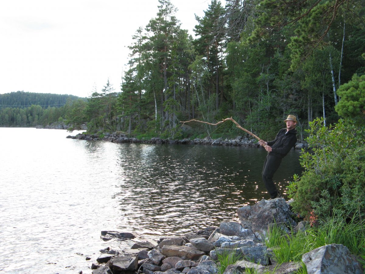 15.07.2014 Leider war das Wetter sehr ungemütlich, sodass Herr M. und Frau A. leider vorerst ihren Rastplatz nicht abbauen konnten und verbrachten den Tag im Zelt beim Lesen oder unterm Tarp mit Schnitzen. Zum späten Nachmittag wurde der Wind weniger und weil die Beiden gerne noch mehrere Standorte auf ihrer Tour sehen wollten, bauten sie ihr Camp ab und schoben ihr Kanu ins Wasser. Auf der Mitte des Sees angekommen ergossen sich alle Wolken auf Herr M. und Frau A..Kurze Zeit später erreichten sie die nächste Insel, bauten Ihr Camp auf und trockneten ihre Sachen. Danach wurden sie von zwei Besuchern der Insel begrüßt, sie tauschten die ersten Erfahrungen aus und erhielten zur Stärkung frisch gebackene Brötchen mit getrockneten Tomaten. Diese Besucher hatten die Insel aufgrund des Wetters seit gestern nicht verlassen und feuerten den gebauten Ofen auf der Feuerstelle den ganzen Tag an, so hatte der Ofen abends die perfekte Temperatur zum backen. Da Herr M. und Frau A. bereits nass waren, nutzen Sie dieses zur Köperwäsche und gingen in den Stora Le. Frisch gebadet zündete Frau A. das Feuer an, schnitt Kartoffeln und Zwiebeln. Leider war die Pfanne recht klein, so dass die Hellewittkartoffeln in drei Etappen gebraten werden mussten.