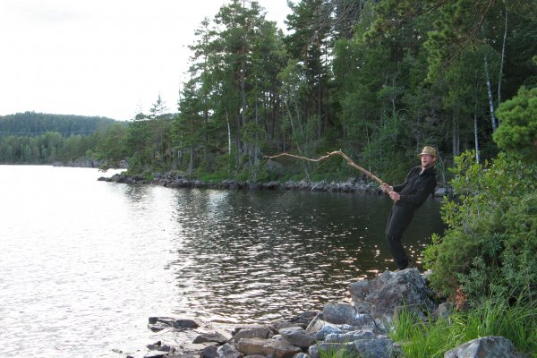 13.07.2014: Nach dem Frühstück wurde die Schlafstätte abgebaut und alles wieder in das Kanu verstaut. Es ging zurück nach L., weil die Isomatte von Frau A. gefunden wurde und sie lieber auf ihrer selbstaufblasenden schlafen wollte. Aufgrund des Wetters mussten die beiden ca. 1km. vor dem Basiscamp notgedrungen einen Zwischenstopp machen, weil die Wellen und der Wind zu stark waren. Sie bauten provisorisch schnell ein Tarp mit der Plane und einem Stock um sich vor dem Regen zu schützen. Kurz darauf machten Herr M. und Frau A. Bekanntschaft mit einem Schweden. Es stellte sich heraus, dass dieser dachte, sie wollten dort für die Nacht campen, aber als mit Händen und Füßen erklärt wurde, dass sie nur die Schauer abwarten wollen würden und danach sein Grundstück wieder verlassen, duldete er dies. Nachdem das Unwetter verzogen war, holten die Beiden die Isomatte ab und fuhren den Foxen See wieder gen Norden. Sie machten eine kurze Mittagspause an Land, aßen geschmierte Brote und Frau A. sammelte Blaubeeren. Nach einer kurzen Stärkung bogen Sie nach Süden auf den Stora Le ab. Die erste schöne Insel mit einer Feuerstelle wurde zum nächtlichen Unterschlupf auserkoren. Das abendliche Schwimmen dufte nicht fehlen.