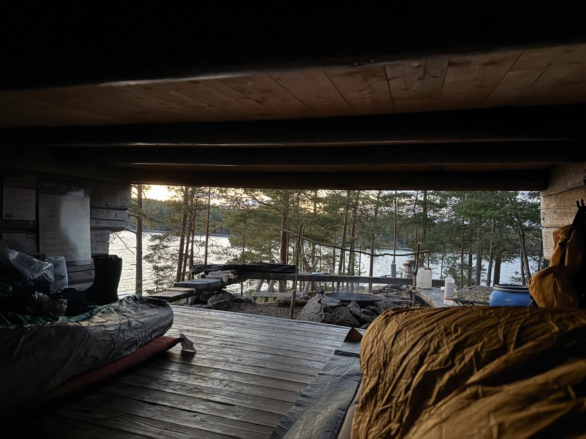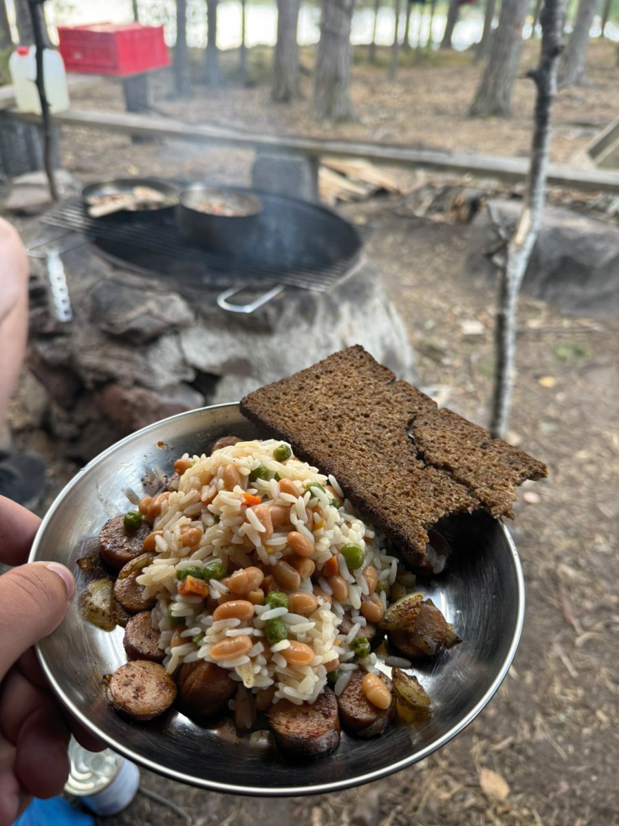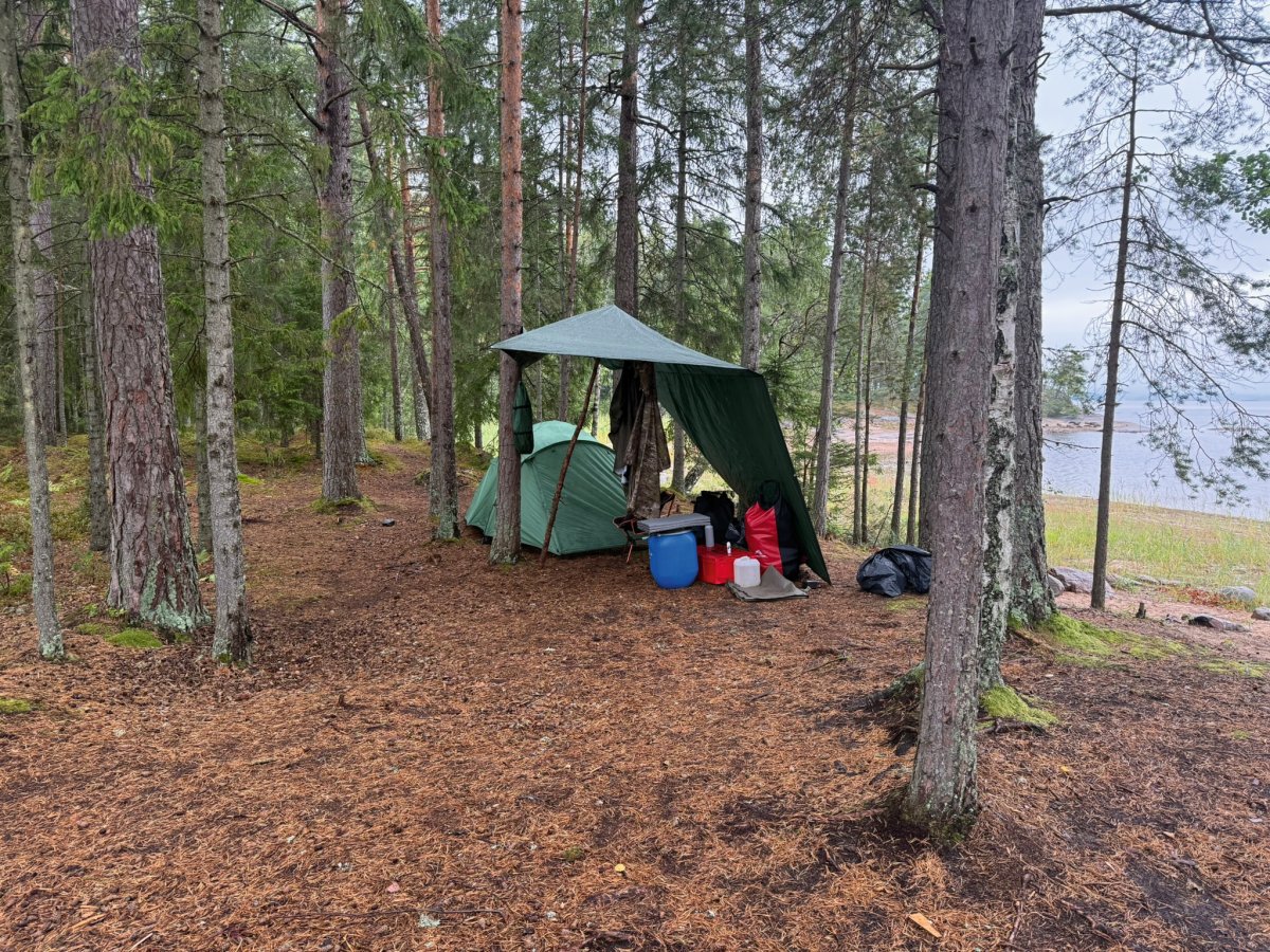 Am nächsten Morgen wurden wir früh durch Hundegebell geweckt. Das wurde immer lauter, bis schließlich ein Jagdhund an unserem Camp vorbeischaute. Er war voll auf seine Aufgabe konzentriert und hat uns total ignoriert. Irritiert aber doch glücklich, dass dieser Hund wohl top ausgebildet war, sind wir dann wieder aufgebrochen. Der Wind war noch immer stark, und ursprünglich wollten wir südlich weiter den Stora Le hinunter paddeln. Doch die Wellen machten uns einen Strich durch die Rechnung. Stattdessen schafften wir es, nur etwa 800 Meter weiter aufs Ost-Ufer zu gelangen, was sich aber als Glücksfall erwies – dort fanden wir einen tollen Wildcampingplatz, der uns den Rest des Tages begleitete. Wir nutzten die Gelegenheit für eine kleine Abkühlung im See, haben geangelt, geschnitzt und einfach nur die Ruhe genossen. Am Abend gab es dann ein leckeres Abendessen in Form von Tortellini mit Käsesauce.