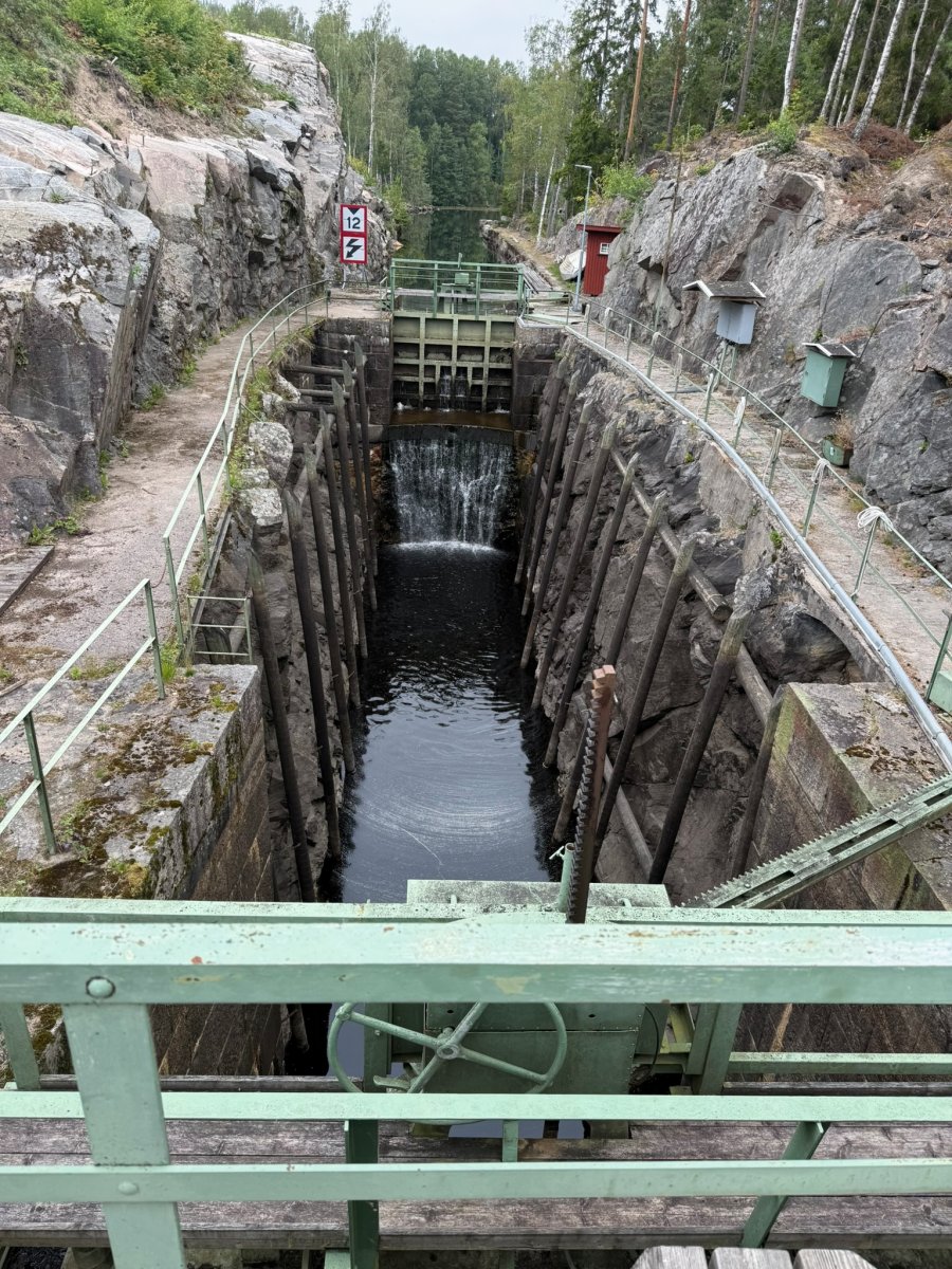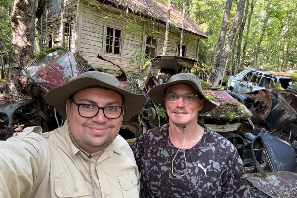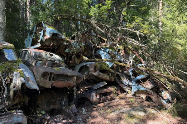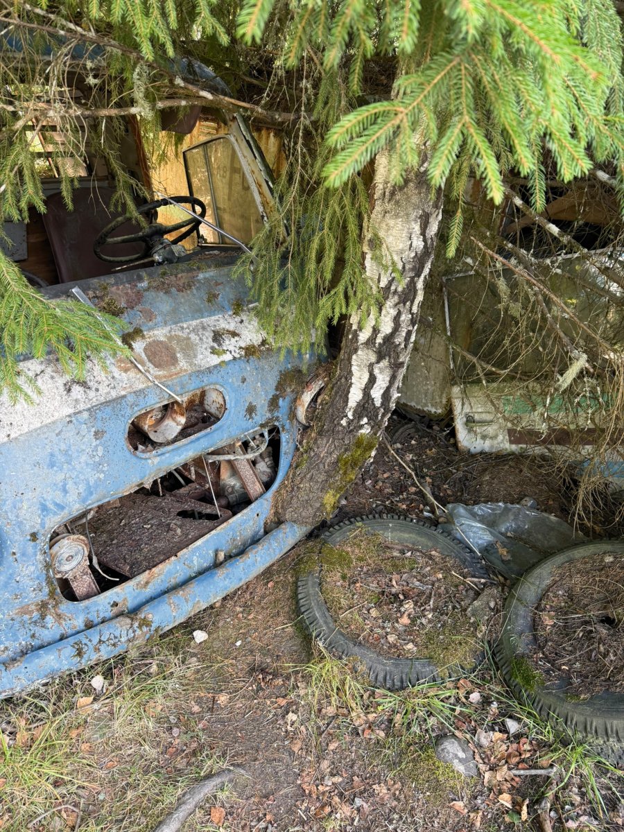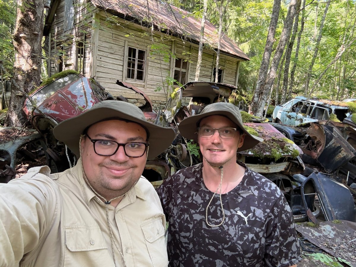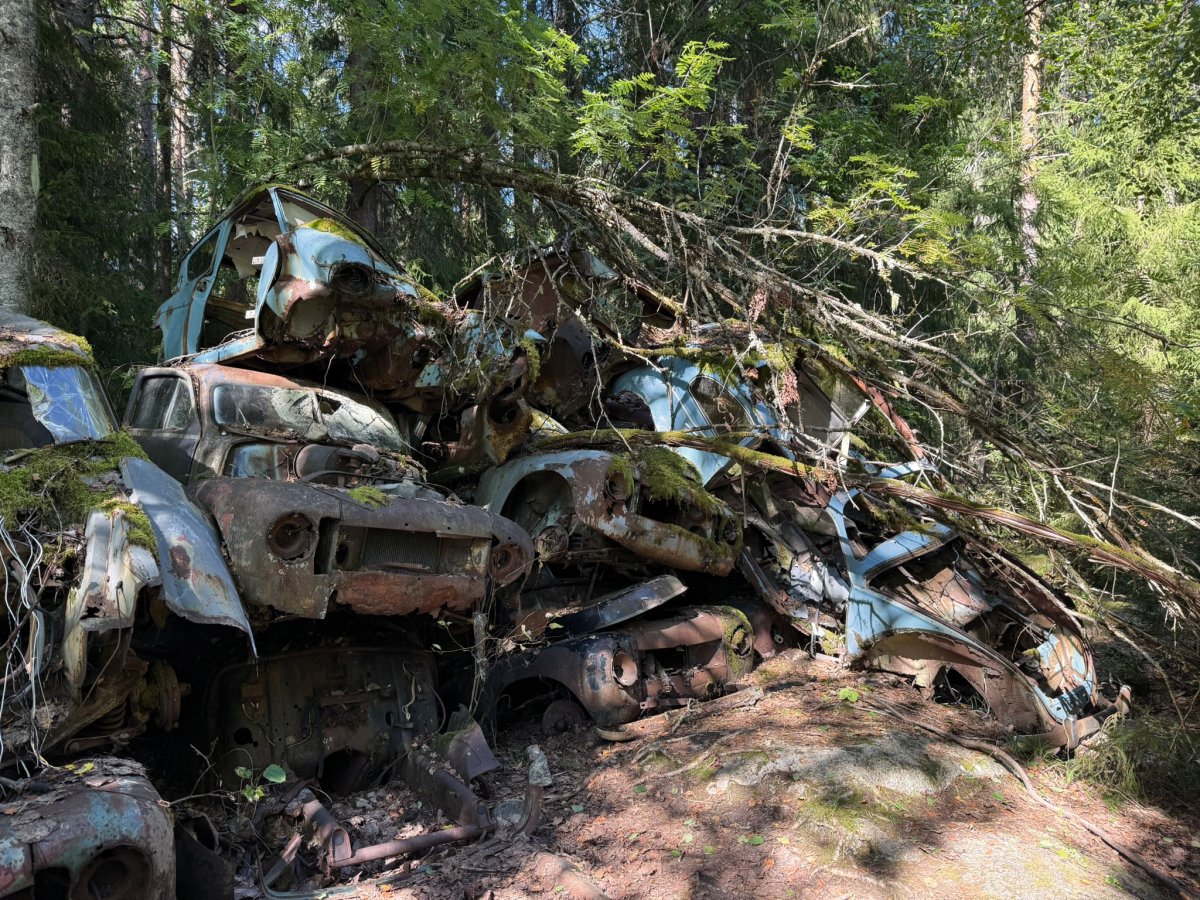 Die Nacht war ruhig, und am nächsten Tag erkundeten wir den See weiter. Der Wind hatte deutlich nachgelassen, so dass wir wieder nach Norden paddelten. An einem schmalen Zwischenstück im Wasser legten wir eine Angelpause ein – und siehe da, gleich der erste Fisch, den wir fingen, war ein kleiner Barsch. Motiviert ging es weiter zum Hafen von Bastnäs, wo wir den Auto-Friedhof besichtigten. Es ist echt kaum zu glauben, wie viele alte Autos, Busse und Autoteile dort im Wald verstreut sind. Inmitten dieses Schrottmeeres stand sogar ein altes Haus, das als Kulisse für einen Horrorfilm glatt durchgehen könnte.