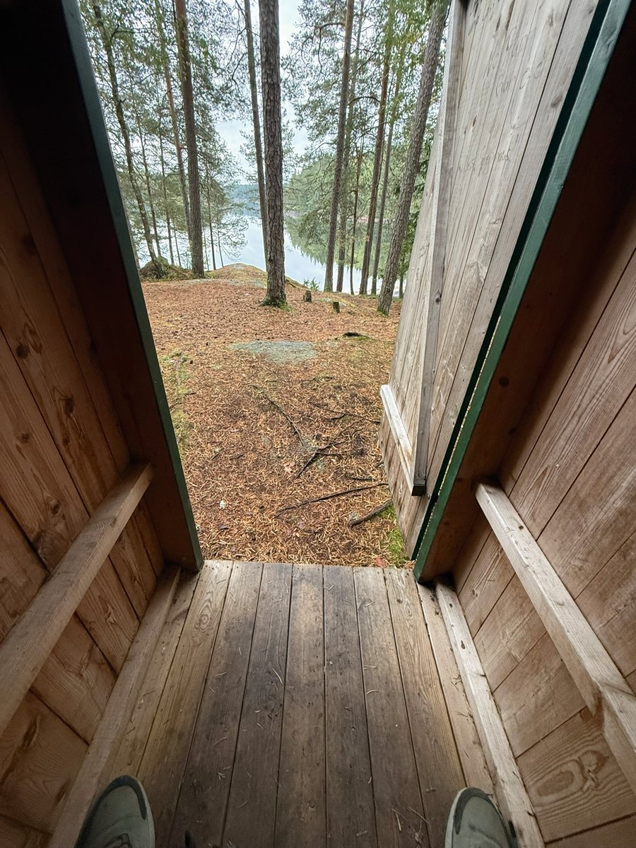 Am nächsten Morgen sagten die Wettervorhersagen Regen vorher, also waren wir vorsichtig. Zunächst blieb es ruhig, und wir nutzten die Gelegenheit, um noch einmal nach Töcksfors zu fahren. Ein kurzer Abstecher ins Einkaufszentrum, ein Selfie vor dem Laden und ein bisschen Einkaufen – das bringt Abwechslung. Und natürlich gönnten wir uns im Supermarkt ein paar Leckereien, die später den Regen erträglicher machten. Als wir wieder zurück auf den See waren, begann es ordentlich zu regnen. Da wir zufällig an DANO 23 vorbeikamen, haben wir entschlossen dort zu bleiben. Nachdem unser Camp aufgebaut war, haben wir den Sandstrand für eine weitere „Waschung“ genutzt, die im Regen wirklich sehr viel Spaß gemacht hatte.