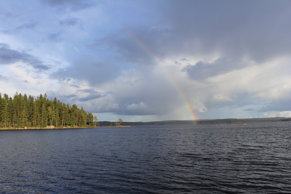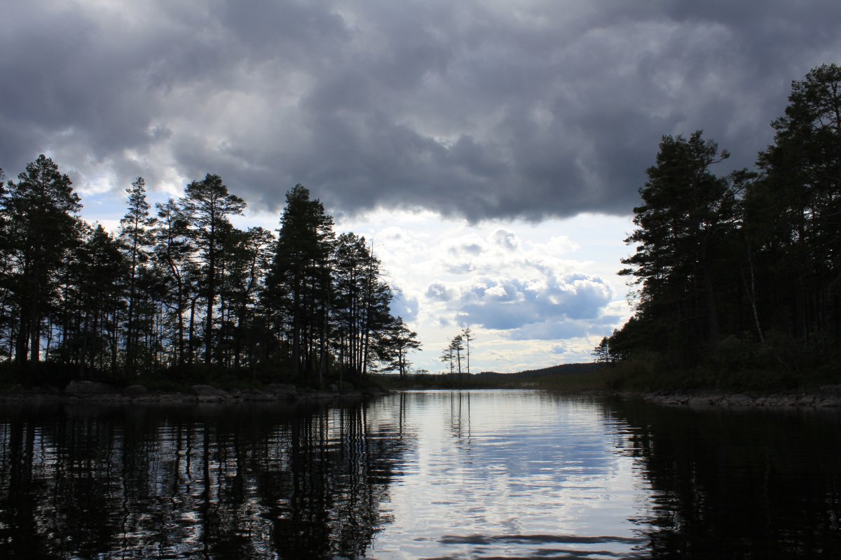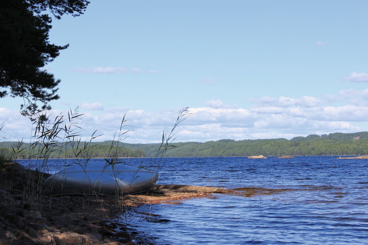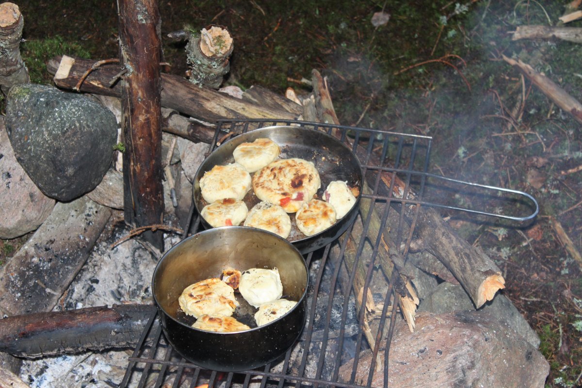 Unser erstes Outdoorfrühstück mit Kaffee, Cornflakes und Wurst- und Nutellabroten stärkte uns für den ersten kompletten Outdoortag, der leider etwas kühl und verregnet war. Allerdings war das auch der einzige Tag mit schlechtem Wetter. An den weiteren Tagen schien meistens die Sonne. Ab und zu gab es mal kleine Regenschauer, aber da konnten wir uns entweder unter Bäumen auf einer Insel unterstellen oder unter dem Tarp, das wir zwischen einigen Bäumen vor dem Zelt gespannt hatten. Die Woche verbrachte wir dann sehr gemütlich mit Paddelausflügen (wir haben viele Inseln auf dem Stora Bör erkundet, sind das gesamte Ufer abgepaddelt und haben dabei Quellen und einen Biberbau entdeckt), Schwimmen im See (der ziemlich kalt war), lesen und einfach die wunderschöne Natur und den Blick von unserer Insel genießen. Wir haben uns sogar daran versucht Outdoorpizza über dem Feuer zu backen, was leider nicht ganz geklappt hat. Aus den Zutaten konnte man aber auch gefüllte Pizzabrötchen improvisieren und die waren so lecker, dass wir sie auch Ende der Woche noch einmal machten.