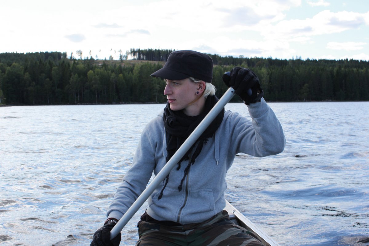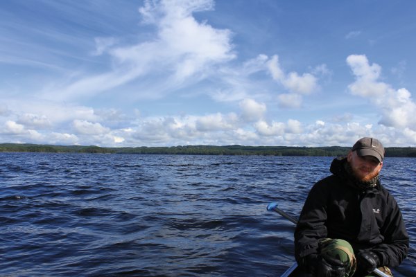 Und dann war es auch schon Samstag und wir waren in Camp Grinsby angekommen, wo wir von einer Scandtrack-Mitarbeiterin empfangen wurden, die uns unsere Ausrüstung gab. Wir bekamen Zelt, Kanu, Paddel, Schwimmwesten und alles, was man sonst noch so in der schwedischen Natur braucht und natürlich Essen für eine Woche. Nach ein paar Tipps, die wir von gerade von ihrer Inselwoche Zurückgekehrten bekamen und nachdem alles, inklusive Hund, im Boot verstaut war und ich meinen Indiana-Jones-Hut aufhatte, konnte das Abenteuer beginnen und wir paddelten los auf unsere Insel (eigentlich eine Halbinsel, was man aber gar nicht bemerkte). Da wir Paddelanfänger waren, sind wir bei unserem Weg zur Insel noch etwas im Zickzack gepaddelt (und haben deswegen wahrscheinlich die doppelte Strecke zurückgelegt), aber schon bei unserem nächsten Paddelausflug am Nachmittag hatten wir den Dreh raus.