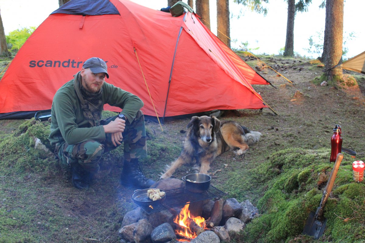 Auf unserer Insel angekommen, suchten wir uns erstmal einen geeigneten Lagerplatz aus. Wir hatten auch relativ schnell eine schöne Stelle, die geschützt zwischen ein paar Bäumen lag, gefunden. Praktischerweise gab es dort auch schon eine Feuerstelle. Die nächsten Stunden verbrachten wir dann damit das Zelt aufzubauen, uns einzurichten, Feuerholz zu sammeln und uns die Insel etwas genauer anzuschaun. Alles zur großen Freude unseres Hundes, der Felsen, Feuerholz und Moos auf dem Boden extrem spannend fand.