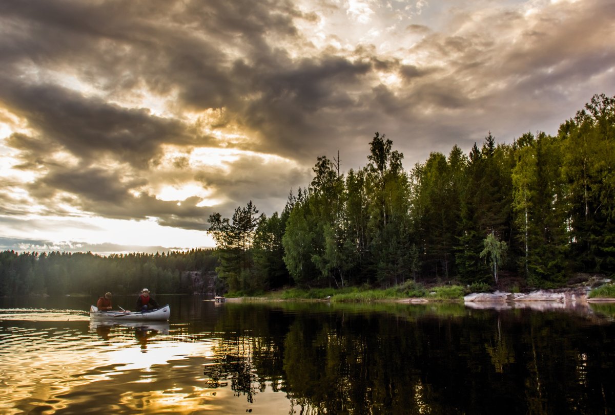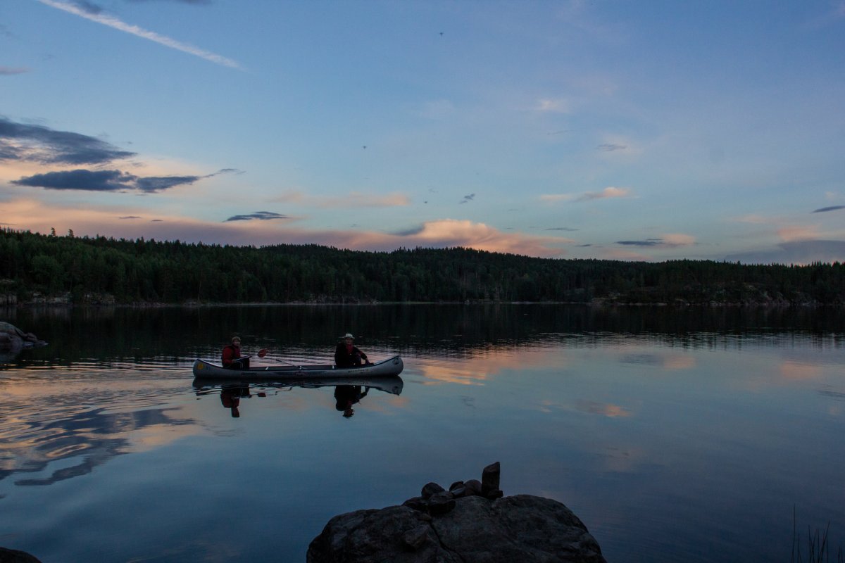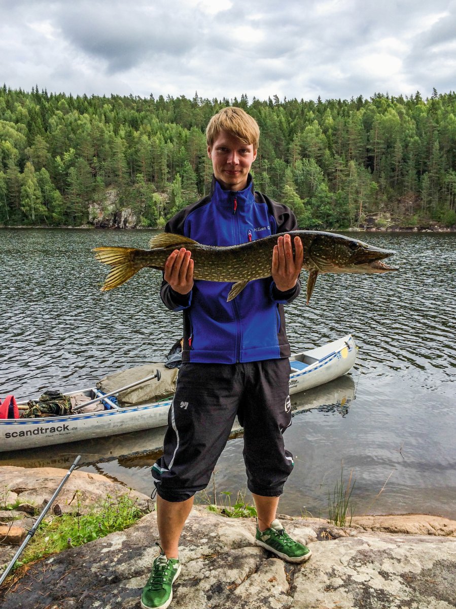 Heute ist früh aufstehen angesagt, denn eine lange Tour zu unserem nächsten Lager steht bevor. Das Wetter spielt mit und dank unserer hervorragenden Zeitplanung können wir uns unterwegs einen Abstecher in eine ruhige Bucht erlauben. Hier lohnt es sich, einmal schnell die Angel auszuwerfen, denn direkt am Ufer ist ein riesiges Seerosenfeld. Schon nach wenigen Minuten beißt ein riesiger Hecht an. Wir hoffen, dass die Angelsehne nicht reißt und nach zehn Minuten steht fest, dass es sich tatsächlich um den großen Fisch handelt, den wir uns schon den ganzen Urlaub lang gewünscht haben: 94cm, 5800g und eine üppige Mahlzeit für vier Personen.