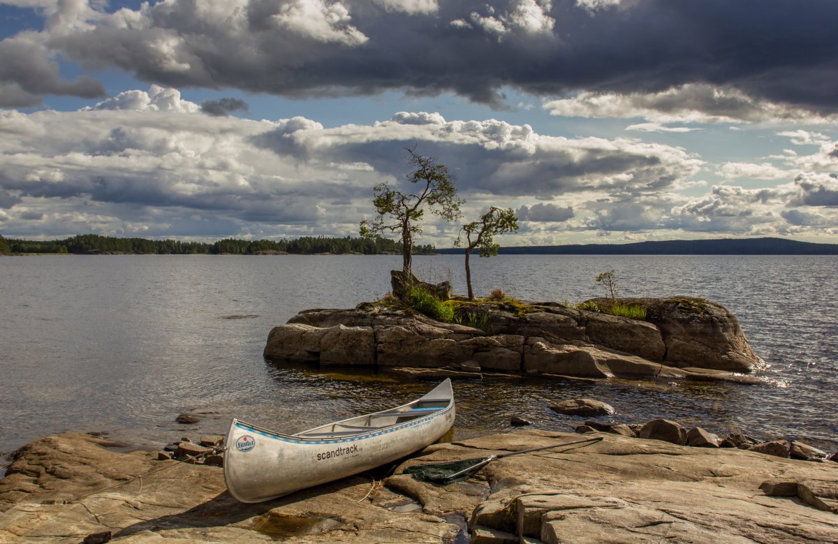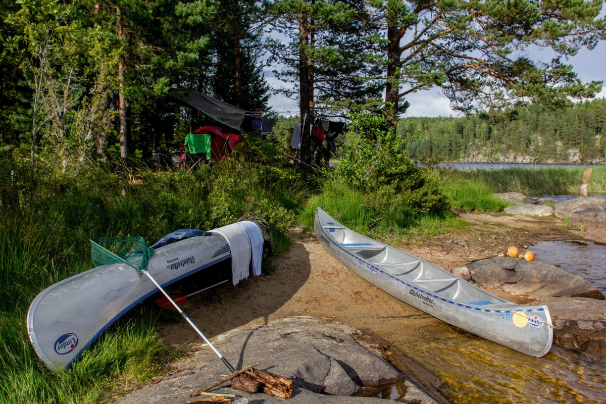 Nach einer langen Fahrt kommen wir pünktlich im scandtrack Basislager an und werden mit einer Verstärkung begrüßt. Das Wetter verschlechtert sich zunehmend, sodass wir bei Regen unsere Kanus beladen müssen, jedoch kann uns das bisschen Wasser von oben unsere Vorfreude auf das bevorstehende Abenteuer nicht verderben, schließlich haben wir uns mit passender Kleidung auf diesen Urlaub vorbereitet. Nach ein paar Stunden ließ sich die Sonne wieder blicken.