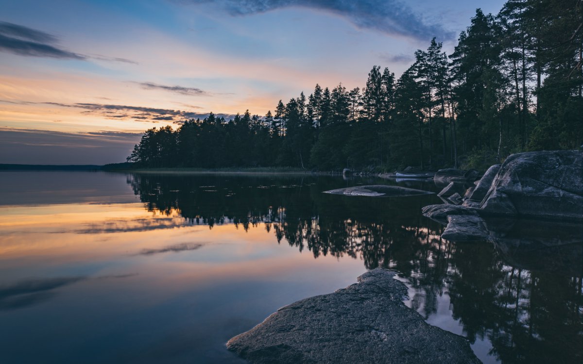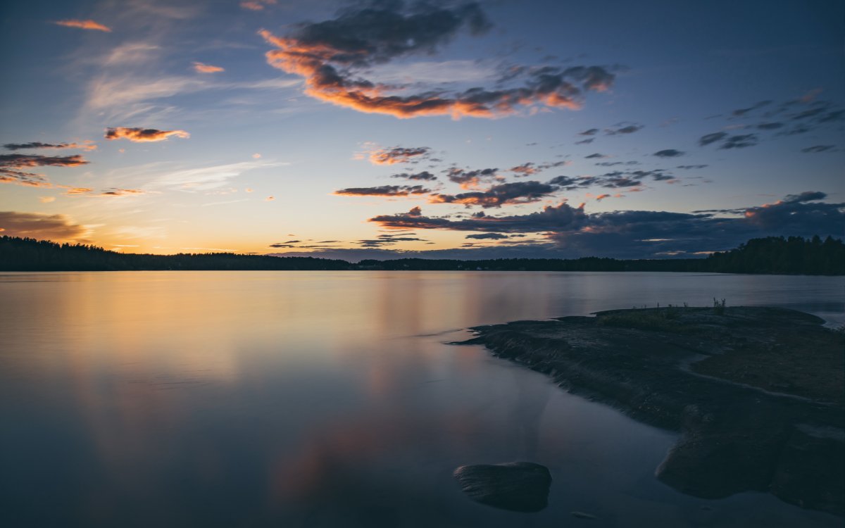 Nach Ankunft im Scandtrack-Basiscamp gab es zunächst einen kleinen Snack und Kaffee zum Kräfte auftanken. Nachdem wir unseren Proviant und die Ausrüstung bekommen hatten, haben wir unsere Sachen in den wasserdichten Packsäcken verstaut und uns auf den Weg zum Strand gemacht um uns in die „Fluten“ zu stürzen. Nach einer kurzen Einweisung und ein paar hilfreichen Tipps von einem Scandtrackmitarbeiter sowie dem Abholen der Anglerkarte wollten wir Richtung Süden aufbrechen. Wir erfuhren, dass an diesem Tag in Lennartsfors Schleusenfest war und die Schleuse zwischen 13 und 15 Uhr geschlossen sein würde und wollten uns in Richtung Dano 68 machen. Als wir kurz nach 13 Uhr aufbrachen, dachten wir, es wäre eine gute Möglichkeit ein Gefühl für das Kanu zu bekommen und testeten uns ein wenig aus, was auch sehr gut gelang. Das Wetter war bis dahin sehr angenehm gewesen, wechselhaft aber trocken. Während wir auf die Öffnung der Schleuse warteten, verdunkelte sich auf einmal der Himmel und das Unvermeidliche passierte, wir wurden in dem Wolkenbruch klatschnass. Nachdem wir die Schleuse passiert hatten, entschieden wir uns an der Ostseite des Lelång-Sees entlang zu fahren. Es war inzwischen später Nachmittag und wir waren uns ziemlich sicher, nicht mehr zum Dano 68 zu fahren, da wir von der langen Busfahrt und dem Regenschauer durchaus geschwächt waren. Wir hielten also nach einem geeigneten Platz für unsere Übernachtung Ausschau. Dank des schwedischen Jedermannsrechts hatten wir diesbezüglich quasi freie Auswahl und landeten auf einer kleinen Insel, die sich als perfekt für die erste Nacht herausstellte. Max kümmerte sich um das Feuer, damit wir uns aufwärmen und uns bald an das Essen machen konnten, während Christoph und ich die Zelte aufbauten und mit dem Tarp unsere Sachen an einem trockenen Ort wussten. Inspiriert vom Film der Busfahrt versuchten wir uns an der Terrence-Hill-Pfanne, die im Outdoor-Kochbuch von Scandtrack zu finden ist und waren hellauf begeistert. Wir genossen die Stärkung am Felsenstrand direkt am Wasser. Danach gingen wir noch baden und Max versuchte sich direkt am Angeln, während Christoph als leidenschaftlicher Fotograf die ersten Bilder machte. Schweden entschädigte uns die Anstrengungen des ersten Tages mit einem sensationellen und unfassbar schönen Sonnenuntergang (gegen 22:30 Uhr!).