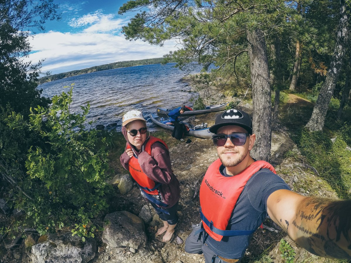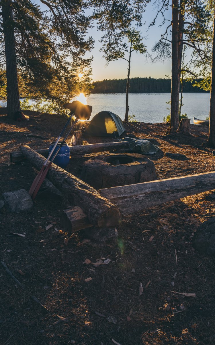 Bevor wir am nächsten Tag aufbrachen, sammelte ich noch Blaubeeren, während die beiden Jungs zusammenpackten und die Kanus wieder beluden. Inzwischen routiniert im Umgang mit den Kanus konnten wir eine größere Strecke zurücklegen. Nach unserer Mittagspause frisch gestärkt brachen wir bei bestem Kanuwetter wieder auf in Richtung Dano 68. Als wir dieses erreichten, war es erst gegen 14 Uhr und wir konnten in aller Ruhe unsere Zelte aufschlagen und genügend Holz für den Abend vorbereiten. Das lag dort vorrätig und wir lernten, dass man gutes Holz durchaus mit zum nächsten Stop mitnehmen sollte – dazu jedoch später mehr. Sogar Zeit für ein Nickerchen war. Im Laufe des Nachmittags trafen noch einige weitere Kanu- und KajakfahrerInnen ein, sodass sich das ein oder andere Pläuschchen am Feuer ergab. Wir durften feststellen, dass in der Wildnis jeder jedem behilflich ist und es wurden bereits einige Tauschgeschäfte abgeschlossen. Wir hatten so reichlich Proviant, dass wir beispielsweise einem Kajakfahrer aus Dresden, der mit uns im Bus angereist war, ein wenig unter die Arme greifen konnten, da dieser sich seinen Proviant selbst besorgen musste. Im Gegenzug gab er uns einige hilfreiche Tipps und erzählte uns beispielsweise von Gustavsfors und wir beschlossen am nächsten Tag dort vorbeizuschauen. Zudem konnten wir bei ihm die Umgebungskarte mit unseren Telefonen abfotografieren. Ein Hoch also doch auch auf Smartphones und Powerbanks, ohne die wir gewiss ein wenig ziellos unsere Zeit in Nordmarken verbracht hätten. Gleichwohl es äußerst entspannend war, das Handy mal nicht permanent in Benutzung zu wissen, wenngleich es eine gute Möglichkeit war, die Lieben Zuhause über unsere Abenteuer zu informieren. Wir nutzten das schöne Wetter auch wieder zum Baden. Bei jedem Badegang empfand man das Wasser auch ein bisschen wärmer, obwohl wir alle auch darüber unsere Späßchen gemacht haben. Christoph und ich erkundeten dann wieder die Umgebung, um Fotos zu machen und Max versuchte wieder sein Glück beim Angeln, was bis dahin leider erfolglos blieb. Nachdem wir uns bis spät in die Nacht noch mit den anderen ausgetauscht hatten, zogen wir uns Stück für Stück in unsere Zelte zurück.