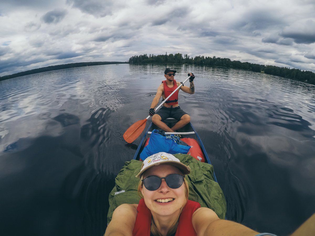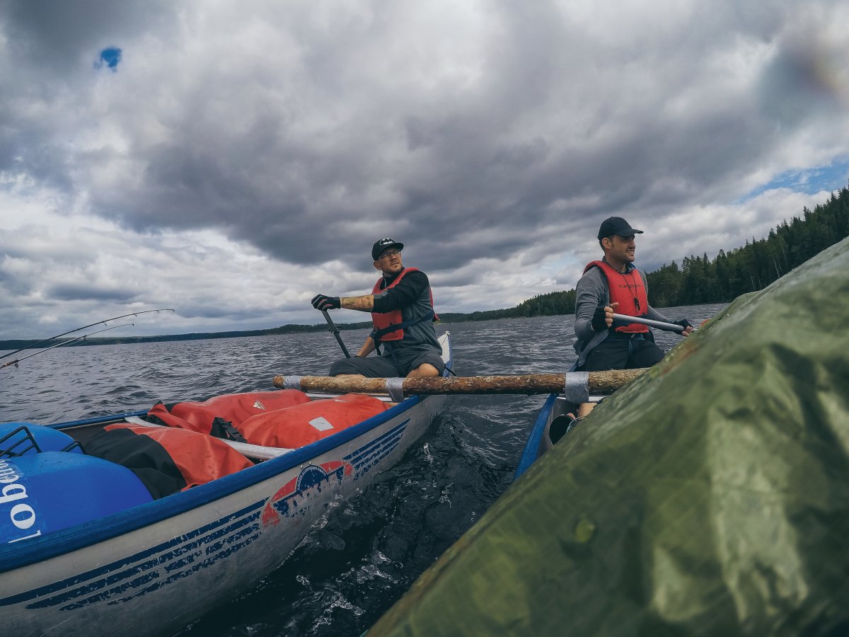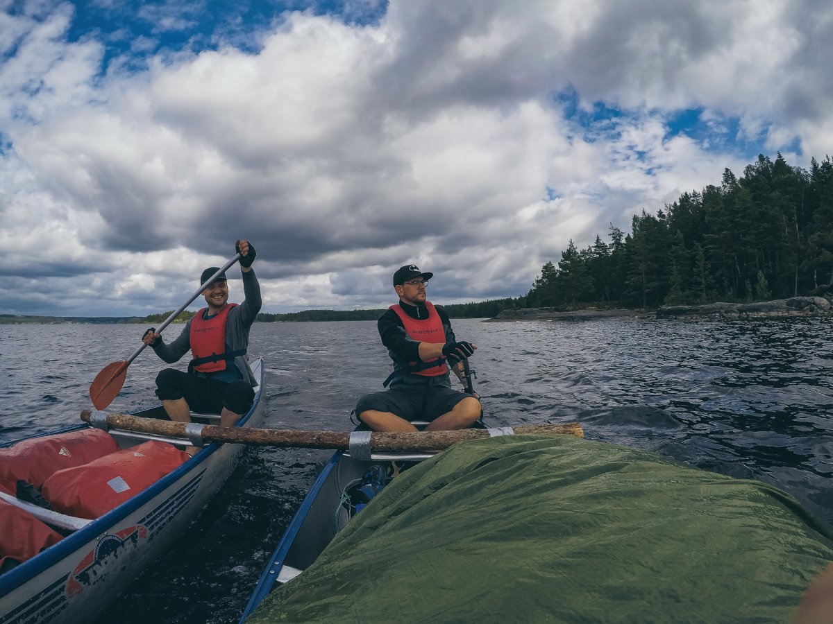Am nächsten Morgen gönnten wir uns einmal Ausschlafen, was sich ein wenig als Fehler herausstellte. Es war zwar diesig, jedoch sah der ruhige See auch so wunderschön aus. Nachdem wir unser spätes Frühstück genossen haben und unsere Sachen gepackt hatten, brachen wir also wieder auf mit dem Ziel, heute Dano 68 zu erreichen. Die Wolken hatten sich in höhere Lagen zurückgezogen und es klarte auf, jedoch kamen damit auch der Wind und die Wellen. Dadurch hatten wir ordentlich zu kämpfen und wurden immer wieder nass. An einer Landzunge, an der wir kurz Rast hielten, fanden wir einen großen Baumstamm, denn wir zersägten und unsere beiden Kanus damit verbunden. Als „Katamaran“ kamen wir etwas besser gegen die relativ hohen Wellen an, jedoch entschieden wir uns erschöpft, unser Ziel auch für den heutigen Tag aufzugeben und einen passenden Platz für die Nacht aufzusuchen, da wir uns nicht übernehmen wollten. Hinzu kam, dass wir unsere Karte – vermutlich durch den Wind – verloren und nicht ziellos fahren wollten. Wir landeten inmitten des Waldes zwischen unzähligen Blaubeersträuchern. Nachdem wir das Tarp zu einem Windschutz aufgebaut hatten, stärkten wir uns zunächst. Am Abend ließ der Wind nur wenig nach. Während Max Feuerholz besorgte, gingen Christoph und ich wieder auf Erkundungstour der Umgebung, um Fotos zu machen und den Ausblick auf den See zu genießen. Wir entschlossen uns, am nächsten Morgen früher aufzubrechen, damit wir unser Ziel endlich erreichen würden.