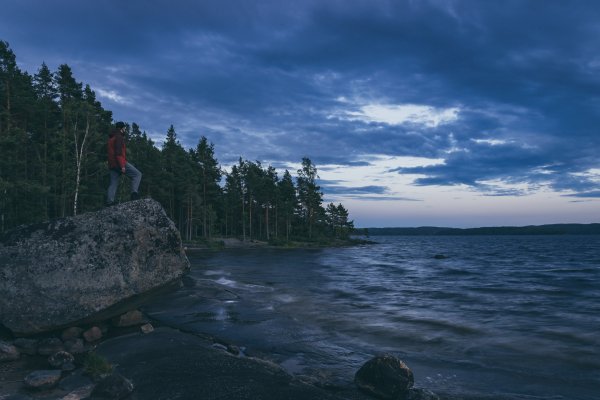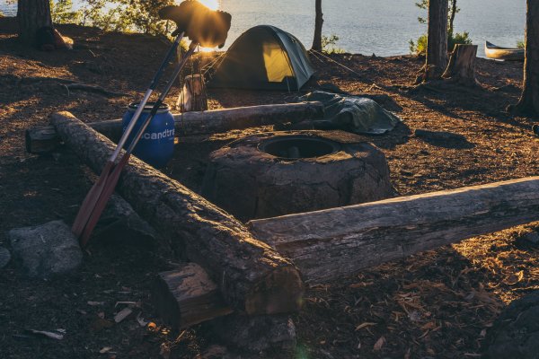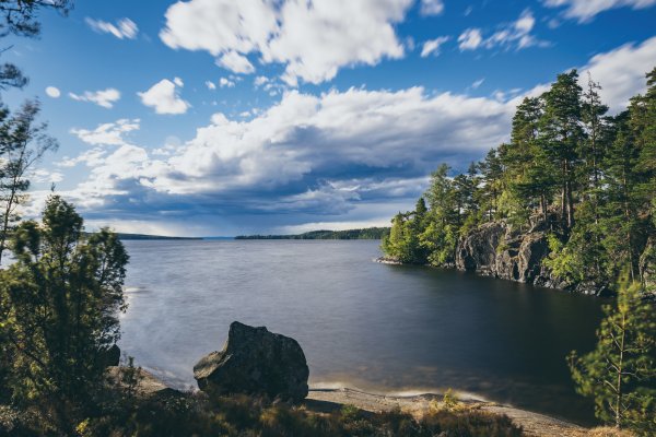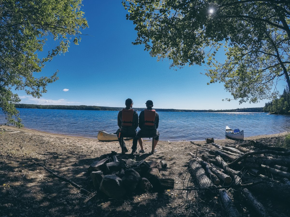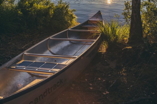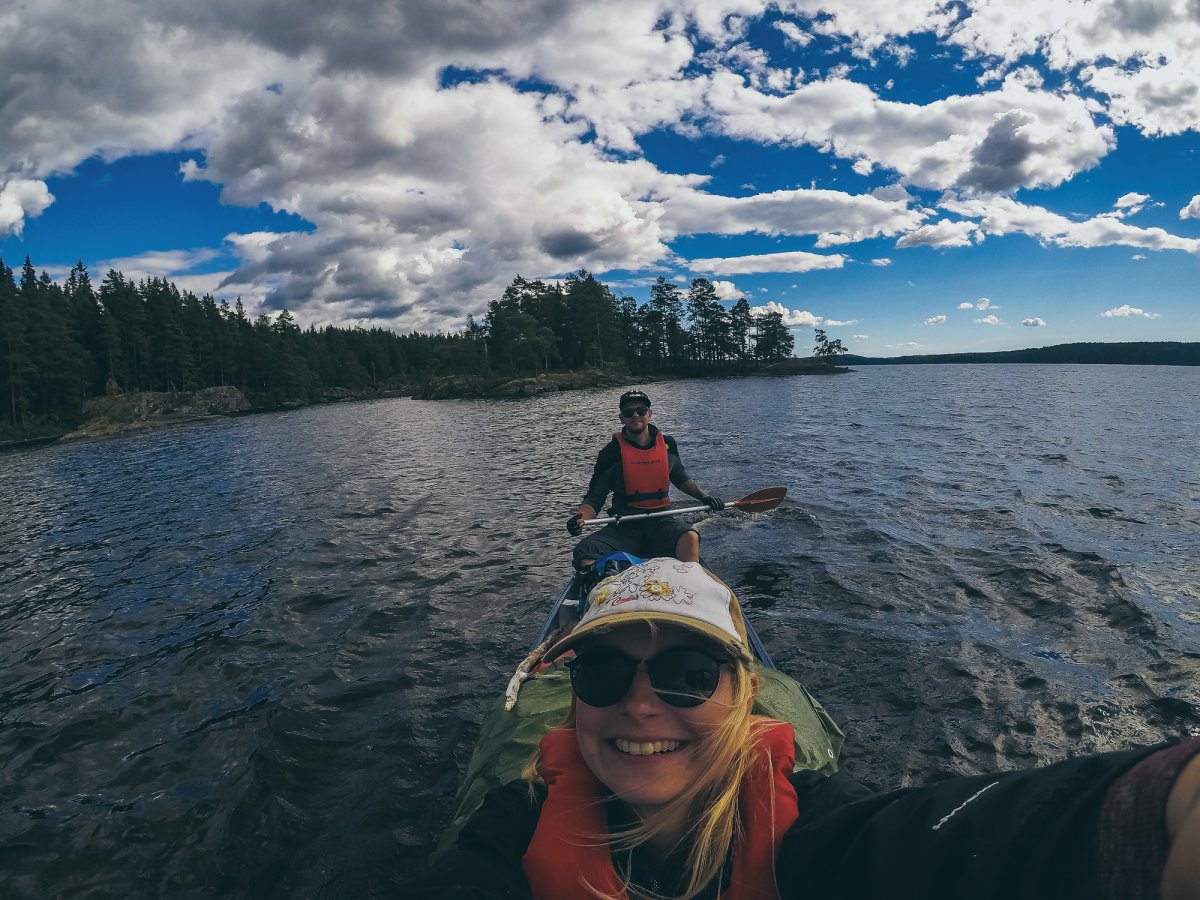 Am nächsten Morgen gönnten wir uns einmal Ausschlafen, was sich ein wenig als Fehler herausstellte. Es war zwar diesig, jedoch sah der ruhige See auch so wunderschön aus. Nachdem wir unser spätes Frühstück genossen haben und unsere Sachen gepackt hatten, brachen wir also wieder auf mit dem Ziel, heute Dano 68 zu erreichen. Die Wolken hatten sich in höhere Lagen zurückgezogen und es klarte auf, jedoch kamen damit auch der Wind und die Wellen. Dadurch hatten wir ordentlich zu kämpfen und wurden immer wieder nass. An einer Landzunge, an der wir kurz Rast hielten, fanden wir einen großen Baumstamm, denn wir zersägten und unsere beiden Kanus damit verbunden. Als „Katamaran“ kamen wir etwas besser gegen die relativ hohen Wellen an, jedoch entschieden wir uns erschöpft, unser Ziel auch für den heutigen Tag aufzugeben und einen passenden Platz für die Nacht aufzusuchen, da wir uns nicht übernehmen wollten. Hinzu kam, dass wir unsere Karte – vermutlich durch den Wind – verloren und nicht ziellos fahren wollten. Wir landeten inmitten des Waldes zwischen unzähligen Blaubeersträuchern. Nachdem wir das Tarp zu einem Windschutz aufgebaut hatten, stärkten wir uns zunächst. Am Abend ließ der Wind nur wenig nach. Während Max Feuerholz besorgte, gingen Christoph und ich wieder auf Erkundungstour der Umgebung, um Fotos zu machen und den Ausblick auf den See zu genießen. Wir entschlossen uns, am nächsten Morgen früher aufzubrechen, damit wir unser Ziel endlich erreichen würden.