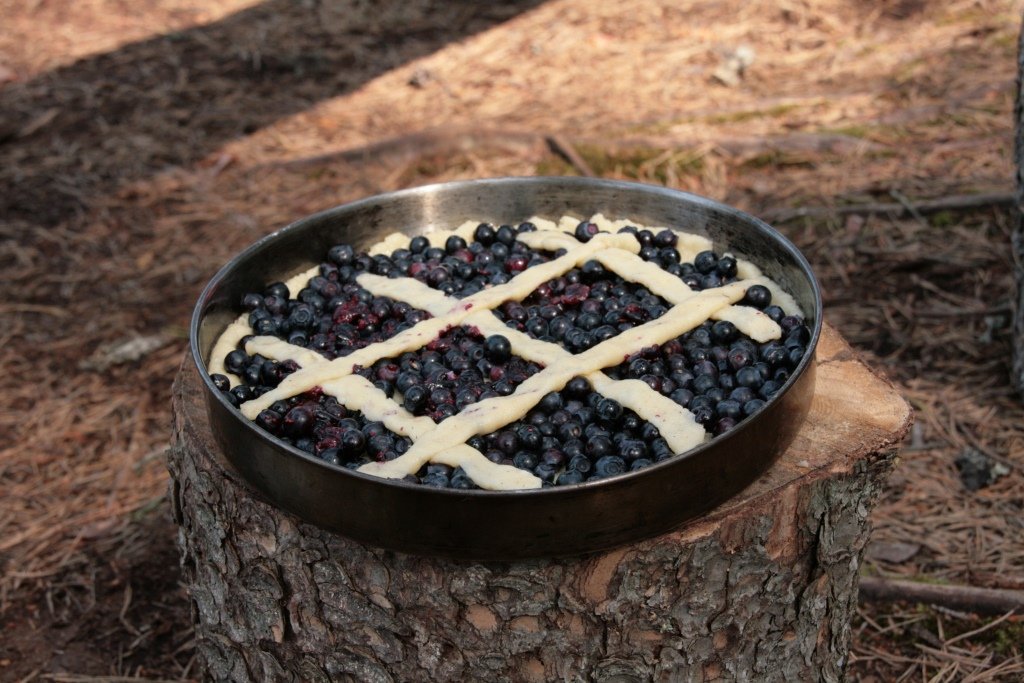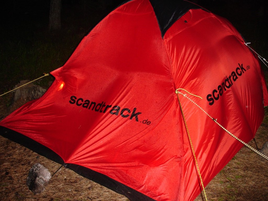 Am nächsten Tag lässt die Sonne auf sich warten. Stattdessen weht ein kräftiger Wind. Die Wellen sind so hoch, dass sie den Frühstücksfelsen unter Wasser setzen. Für uns kein Problem: Wir frühstücken im Zelt. Danach drehen wir eine große Inselrunde, suchen Feuerholz und entdecken die ersten Blaubeeren. Wir beschließen, auf Beerenjagd zu gehen, während der Wind weiter kräftig bläst. Die Mühe lohnt sich. Abends erfüllt der Duft von saftigem Blaubeerkuchen unser kleines Eiland. Die Stärkung können wir brauchen, denn in der Nacht zieht ein Gewitter auf. Das Material von Scandtrack und unsere Nerven werden auf den Prüftstand gestellt. Ausgerüstet mit Stirnlampen, Seilen und Steinen spannen wir das Zelt noch einmal ab und befestigen alles, was wegzufliegen droht. Einen Plan B gibt es nicht. Den braucht es auch nicht, denn das Material ist super und unser persönliches Krisenmanagement hat funktioniert. Durchatmen.