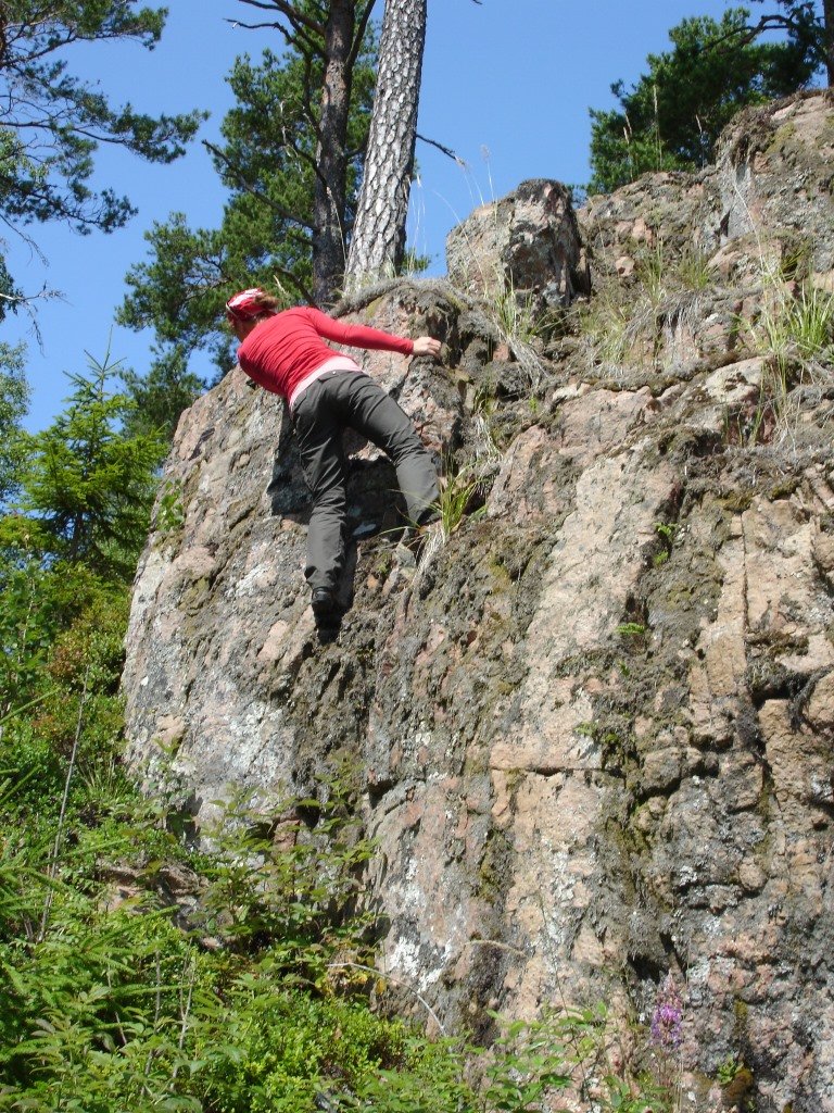 An den nächsten Tagen erkunden wir das Festland. Mit dem Kanu kann man überall anlanden und stundenlang durch die Wälder wandern. Festes Schuhwerk ist hier sinnvoll! Immer wieder türmen sich bizarre Felsformationen auf. Auch ohne alpines Klettergerät besteigen wir die meisten von ihnen problemlos. Der Ausblick entschädigt für die Mühe und mit dem Inhalt der Lebensmitteltonne lassen sich wunderbare Lunchpakete packen. Doch Vorsicht: Wer sich an den Rand der Karte wagt, sollte sich auf seine Orientierung verlassen. Zum Glück waren wir zu Zweit (und ohne Kompass) unterwegs. So hatte jeder seine eigene Meinung zum richtigen Weg. Am Ende kamen wir doch immer wieder gemeinsam an.