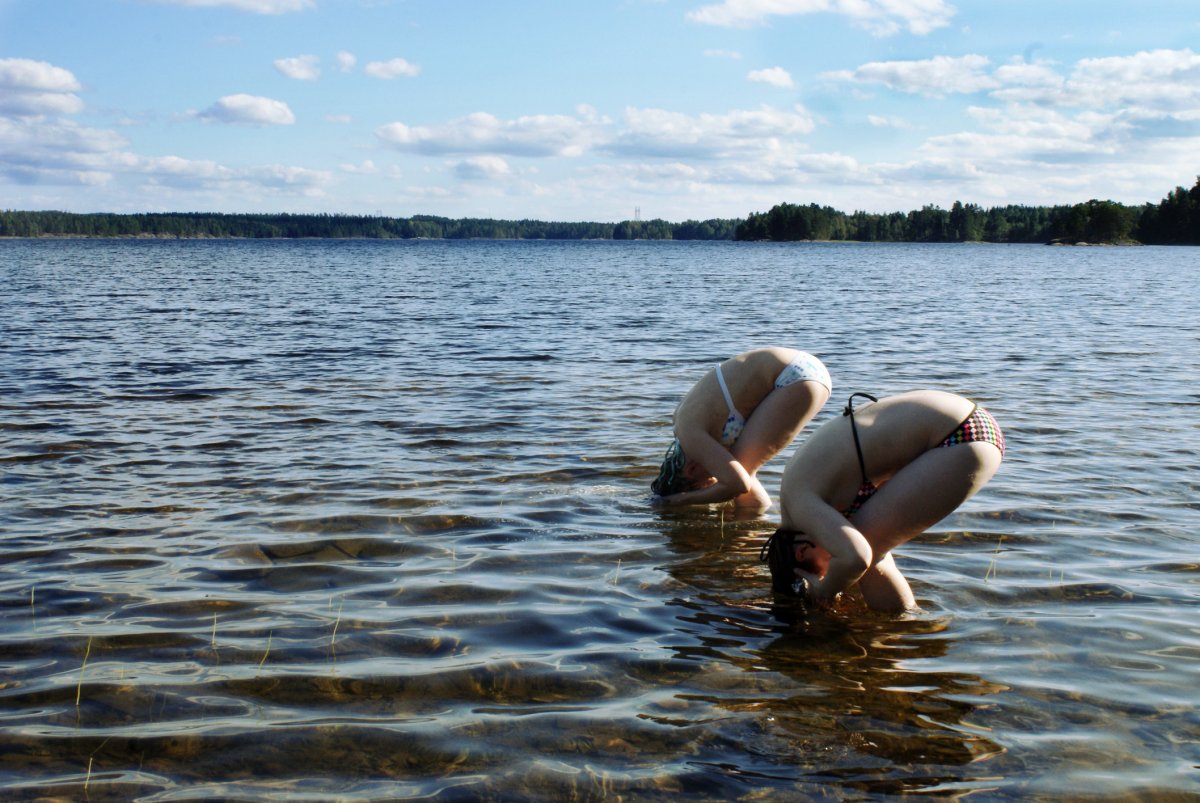Das Schlimmste kam direkt zu Beginn: Die Busfahrt. Theresa (meine Aachener Mitstudentin) und ich hatten ab Bielefeld gebucht und checkten dort pünktlich und unkompliziert ein. Nur leider war unser Bus sehr eng bemessen. Das war fürs Sitzen nicht weiter schlimm, aber wir fuhren über Nacht und schlafen konnte ich in solch aufrechter Position überhaupt nicht. Also quetschte ich mich in irgendwelche Ritzen und Theresa rollte sich auf ihrem Sitz zusammen - in jedem Fall ein Horror für unsere beiden Rücken. Fairerweise tauschten wir nach der halben Fahrt die Plätze, sodass Theresa sich auch noch mal ans Fenster anlehnen konnte… dennoch holte ich mir eine so üble Verspannung im Nacken, dass ich mich vier Tage lang nicht mehr bücken konnte. Meine größte Sorge, nämlich gar nicht schlafen zu können und deswegen vor Kopfschmerzen umzukommen, trat allerdings nicht ein. Meinem Kopf ging es blendend. Schon bevor wir um halb eins in Puttgarden ankamen, hatte ich bereits mindestens anderthalb Stunden tief durchgeschlafen. Dafür war der Bus also wohl doch noch gemütlich genug. An eben jenem Fährhafen auf Fehmarn sollten nun eigentlich noch unsere zwei Mitpaddler aus Freiburg mit einsteigen. Aber unser Bus fuhr ohne zu zögern an allen Wartenden vorbei. Kaum waren wir nach kurzer Wartezeit auf die Fähre gestiegen, bekam ich eine fassungslose SMS von den beiden, dass sie wohl noch zwei Stunden auf ihren Bus warten müssten und sich fragten, wo wir denn wohl seien...? Wir waren aber mittlerweile in Dänemark und mein Handy hatte seinen Dienst quittiert. In Dänemark versuchte ich weiterzuschlafen und erst auf der Fähre nach Schweden unternahm ich weitere Versuche Kontakt aufzunehmen, aber weiterhin erfolglos. Zwei Stunden lang ruckelten wir dann über schwedische Landstraßen-Bodenwellen, ehe wir im Camp bei Lennartsfors in Mittelschweden ankamen. Dort war uns erstmal schlecht. Nach etwa zwanzig Minuten schafften wir es schließlich zu zweit, eines der angebotenen Brötchen mit Würstchen in uns hineinzumümmeln. Glücklicherweise hatten wir ja eh genügend Zeit, uns zu erholen, schließlich mussten wir noch auf unsere beiden Freiburgerinnen warten. Und so gingen wir abwechselnd über die Wiese und legten uns auf die Holzbänke, in der Hoffnung, sowohl die Müdigkeit als auch die Nackenschmerzen zu vertreiben. Was die Müdigkeit anbelangt, gelang uns das sogar. Was die Schmerzen anbelangt: Nun ja. Man kann nicht alles haben.