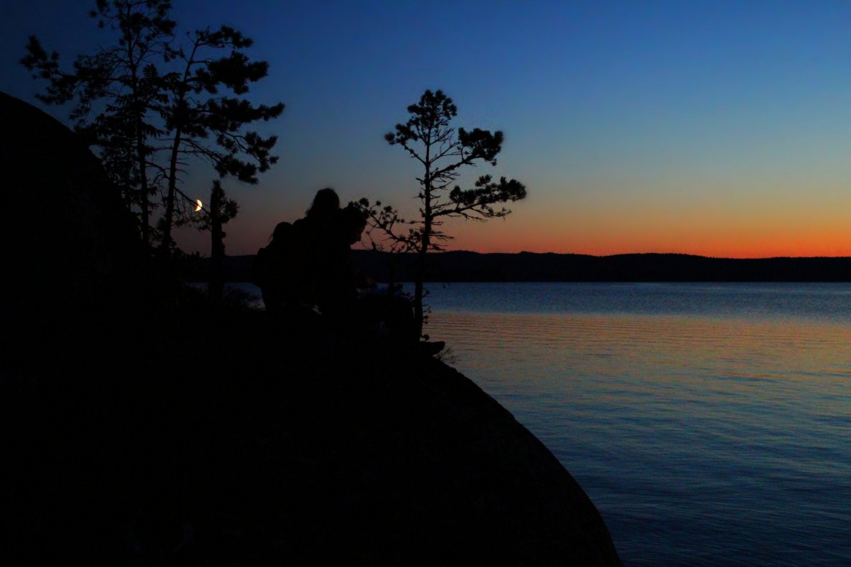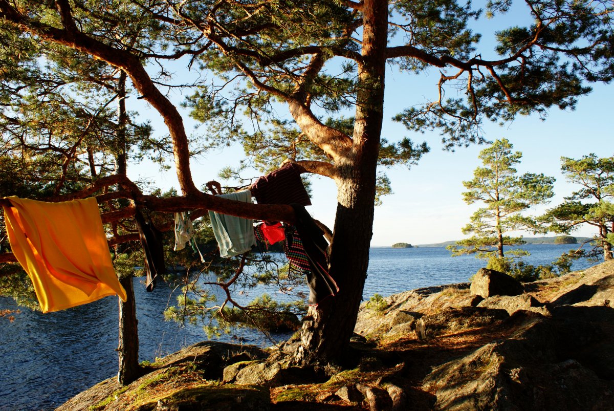 Nach einer guten Viertelstunde ging es weiter und von da aus waren wir penibel bedacht, so nah am Ufer zu bleiben, wie es einem Kanu nur möglich ist. Mit Erfolg. Als Übernachtungsmöglichkeit fanden wir eine herrliche Insel ohne Hütte, aber mit Klo und zwei Feuerstellen. Wir badeten in einer Bucht und fühlten uns gut. Die Nacht war klar und lau und wir entschlossen uns in der Dämmerung, kein Dach mehr über uns haben zu wollen. So zogen wir unsere Matten und Schlafsäcke aus den schon aufgebauten Zelten wieder heraus, legten uns auf die platten Felsen und schauten ehrfürchtig in den Himmel. Der See unter Dir, die Lagerfeuer in der Ferne, die Milchstraße über Dir und hin und wieder eine Sternschnuppe, die vorbeirauscht: So muss Outdoor-Urlaub sein. Genau deshalb machen wir das. Wegen solcher Momente.