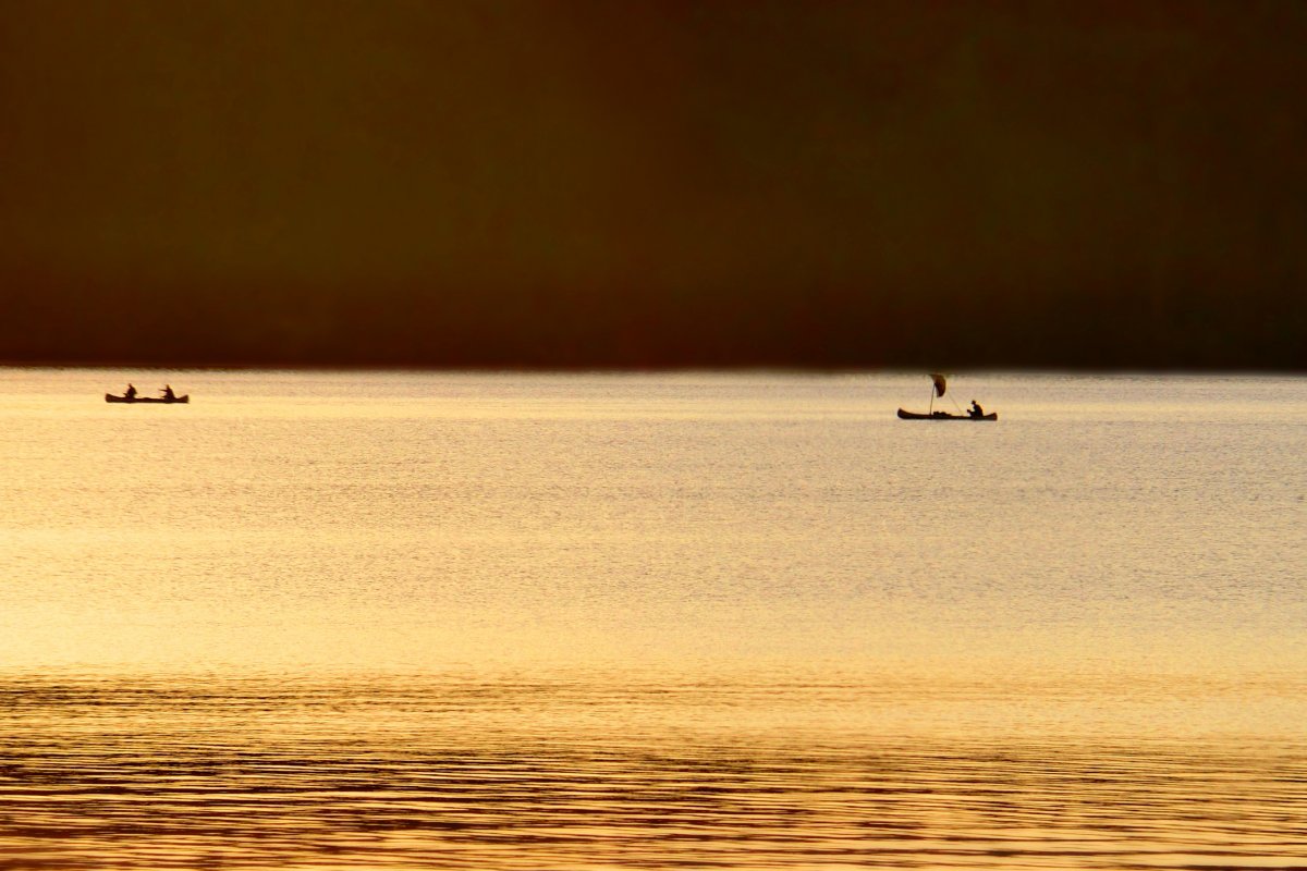 Eine halbe Stunde später dümpelten wir hoffnungslos über den See. Die Ufer schienen in noch bedrohlicherem rot zu leuchten. Alles voll. Alles besetzt. Schließlich erinnerten wir uns unserer Taktik vom ersten Tag, guckten uns eine Insel aus und umrundeten sie einmal ganz. Und tatsächlich: Auf der Seite, die dem Festland abgewandt war, fanden wir noch zwei Zeltplätze und eine Feuerstelle. Zwar kein Klo, aber ansonsten für uns wirklich perfekt. Zum Baden war uns zu kalt, aber zumindest hängten wir ein letztes Mal unsere Haare ins Wasser, rösteten uns abends ein paar Marshmallows und gingen früh zu Zelt.