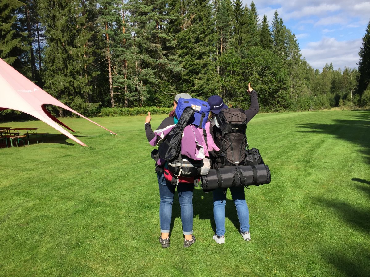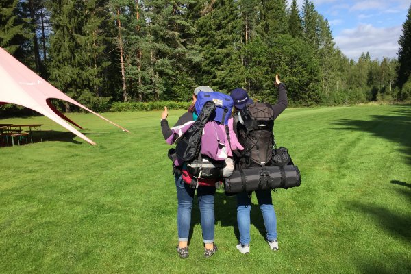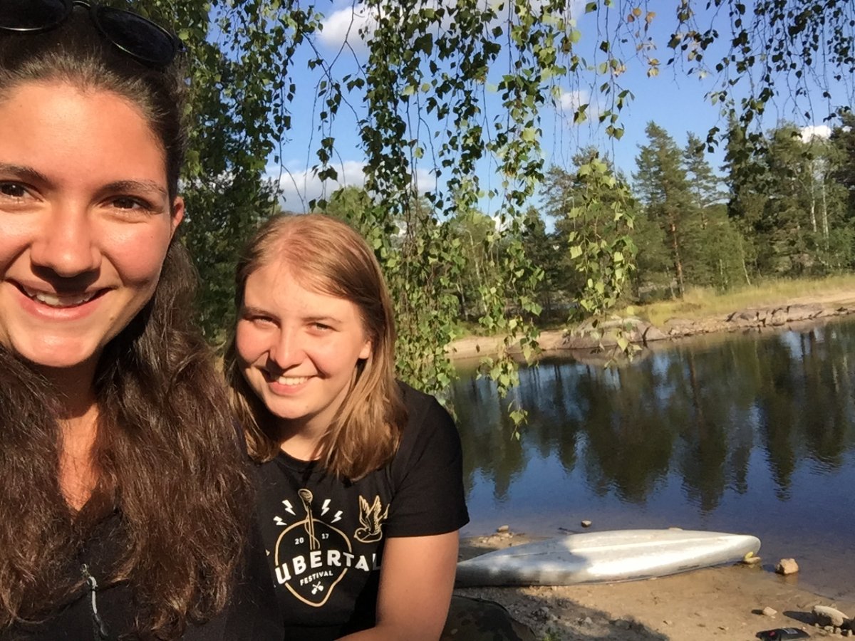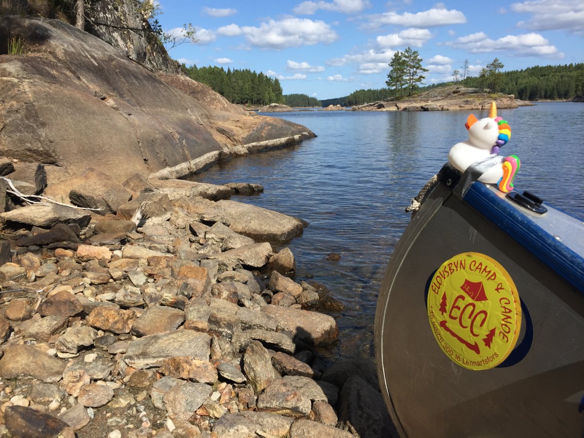 Zwei Mädels mitten in der schwedischen Natur - eine davon, nämlich ich selbst, habe ein paar Wochen vorher überhaupt je in meinem 21-jährigen Leben zum ersten Mal in einem Zelt geschlafen...wir wussten also, das könnte spannend werden...dennoch machten wir uns voller Vorfreude dann endlich auf den Weg nach Berlin, um dort mit dem Scandtrack Express loszufahren. In Lennartsfors angekommen waren wir direkt überwältigt von der Landschaft, vor allem weil uns Schweden mit viel Sonnenschein begrüßt hat. Nachdem wir unsere Ausrüstung geholt und umgepackt haben, ging es nach der Kanueinweisung auch direkt aufs Wasser. Dort stellten wir dann allerdings fest, dass wir vom Lenken nicht viel verstanden hatten. Wie soll das denn gehen mit diesem J-Schlag? Ich versuchte es ein paar Mal und habe mich dabei so ausgesprochen blöd angestellt, dass mir direkt alles weh tat. Naja, aber Not macht ja erfinderisch, also beschlossen wir einfach eine eigene Paddeltechnik einzuführen. Ständig wechselten wir die Seiten, paddelten mal auf der selben Seite, zwischendrin mal wieder auf den gegenüberliegenden Seiten...völlig verkehrt also, aber wir kamen die ganze Woche damit immer an unser Ziel. Wenigstens haben wir den C-Schlag verstanden und so paddelten wir beide einfach immer im C wenn wir mal eine Kurve fahren wollten..."C und dann da rüber" wurde zu unserem ausgesprochen guten Navigationsruf. Vielleicht lag es aber auch an unserem Maskottchen vorne auf dem Kanu, dass wir immer dort ankamen, wo wir hinwollten ;-)