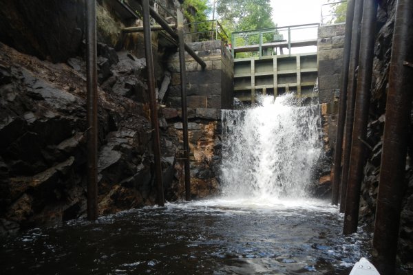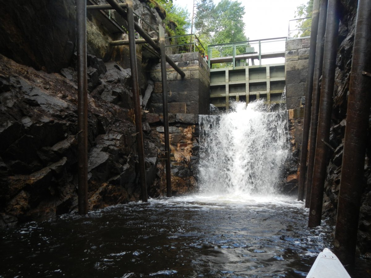 Vor der Schleuse trafen wir noch auf drei norwegische Jungs in ihren Kajaks. Der Himmel war im Süden sehr dunkel aber über uns stand noch die Sonne. Wir legten uns etwas in unseren Kanus zurück und warteten auf den Schleusenwärter. Kurz bevor es in die Schleuse gehen sollte zogen wir unsere Regenkleidung an.