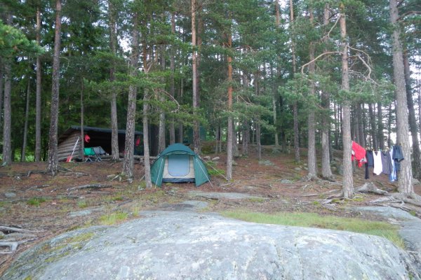 Wir paddelten die ganze Zeit am Westufer in der Sonne. Das Dano 17 war schon belegt und auch sonst schien die Insel stark belegt gewesen zu sein. Wir paddelten über den Foxen bis zum Dano 13/14/15/16 auf Getön. Auch hier war es sehr voll. Wir fanden einen Platz zwischen den Danos 14 und 16 mit Blick in Richtung Südwest. Schon abends stellten wir schmerzhaft unsere roten Schienbeine fest... Heijeijei... die haben wir uns richtig böse verbrannt, aua...