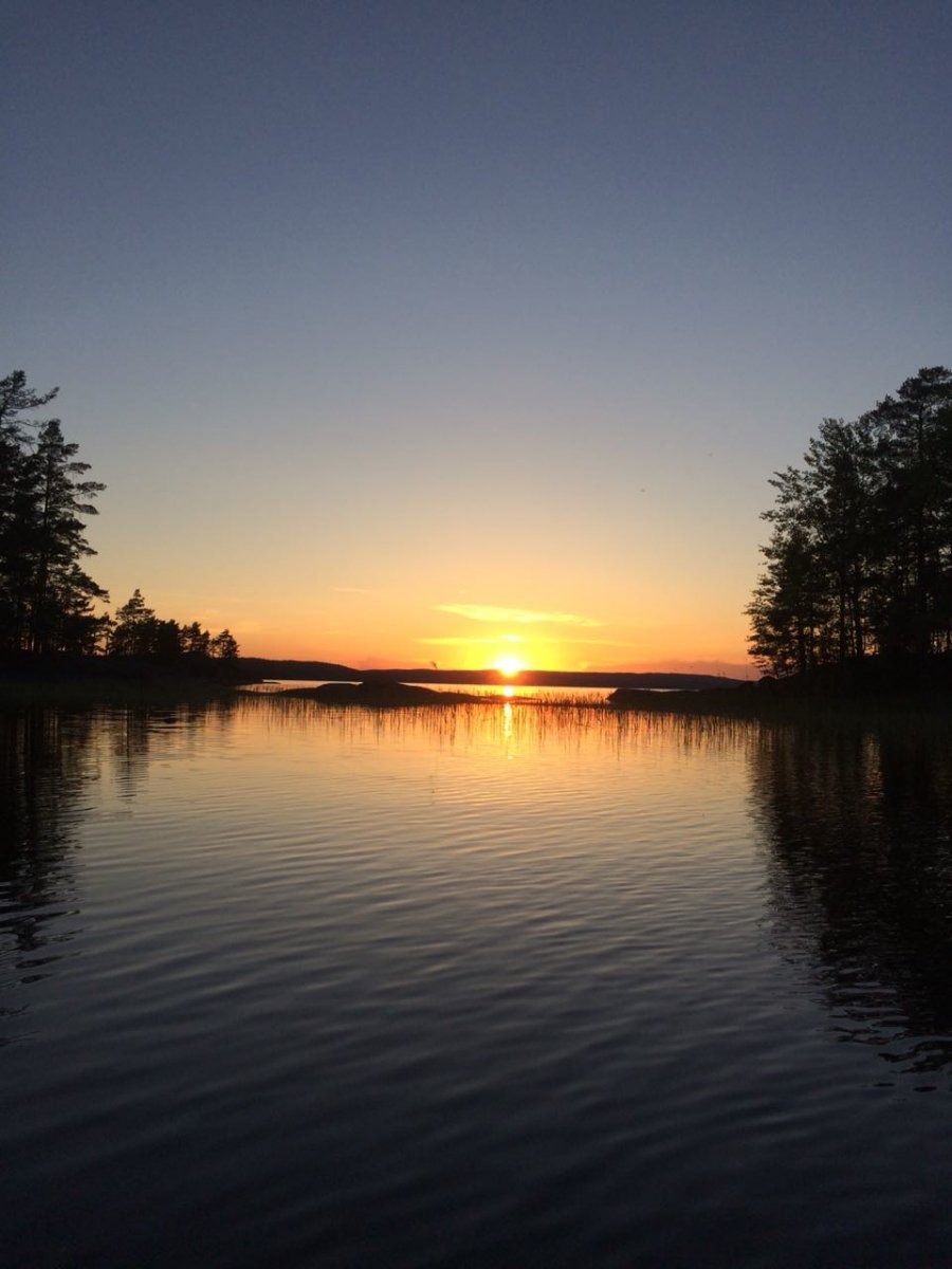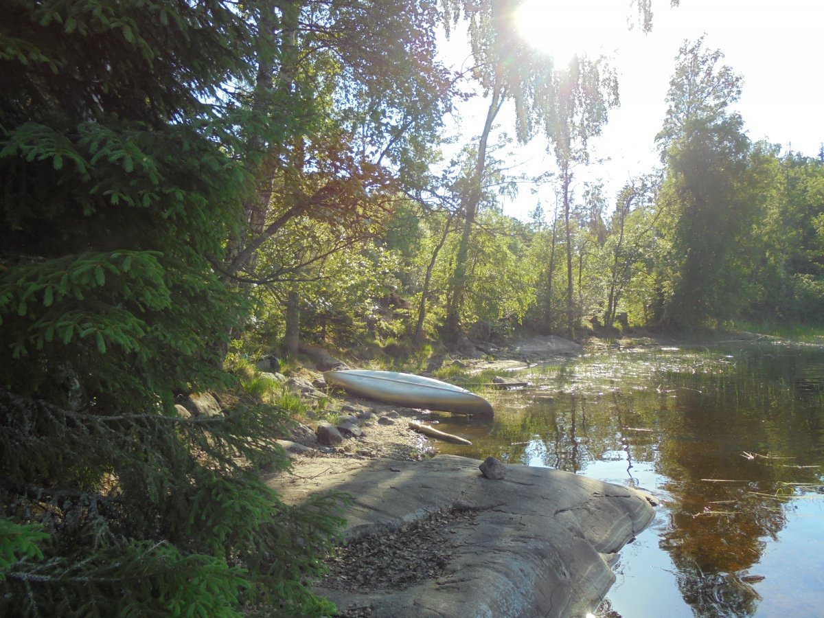 Am Tag 4 war wieder herrlichster Sonnenschein und uns zog es weiter den Foxen hoch, diesmal waren es 10 km und wir landeten bei Dano 21.Mittlerweile wirklich eingespielt, was Essen machen, Schlafplatz herrichten und Toilette suchen angeht. Wenn wir damit fertig waren, hieß es, Baden, Lesen, Seele baumeln lassen. Am 5 Tag gings ab nach Töcksfors. Es war ein sehr heißer Tag und somit war der Bummel im kühlen Einkaufscenter sehr angenehm. Wir gönnten uns auch den Luxus eines Mittagessens, welches nicht vom Kocher kam. Unser Nachtlager schlugen wir dann später im Dano 20 auf, wo Femke dann Elchködel und Knuspermüsli machte. An Tag 6 sind wir unsere längste Etappe von gut 12 km gepaddelt, mittlerweile in Richtung Süden, den Foxen wieder runter. Am Dano 16 hatten wir auch wieder viel Zeit zu entspannen und es war der erste Abend an dem wir nochmals ins Kanu gestiegen sind damit wir den Sonnenuntergang besser sehen konnten.