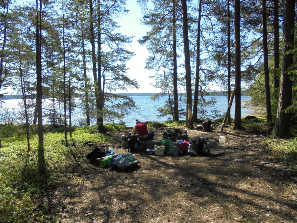 Gut für uns, somit mussten wir die Axt nicht mitschleppen. Irgendwann saßen wir komplett ausgestattet und völlig erschöpft in unserem Kanu und es konnte los gehen. Geradeaus paddeln, wenn man keine Ahnung hat, ist das nicht so leicht, zumindest nicht für uns. Hatte ich erwähnt, dass Sport nicht so unser Ding ist. Nach gut 3 km ( gefühlte 10) haben wir einen Platz gefunden, der für uns, unser 1. Nachtlager sein sollte. Es war kein Dano, aber es gab eine Feuerstelle mit Sitzplatz, also Zelt aufbauen und erstmal realisieren, was wir hier machen. Sich mit dem Kochbuch vertraut machen, nochmal nachlesen, wie man geradeaus fährt usw. Wie erwähnt, haben wir noch nie einen Outdoor Urlaub gemacht und so war es nicht verwunderlich, dass wir mit dem Kocher erstmal nicht zurecht kamen und unser erstes Abendessen (Bratkartoffeln) etwas roh ausfiel. Wir holten uns Tipps aus der Heimat und es stellte sich heraus, wir waren einfach nur zu ungeduldig und ungeschickt.