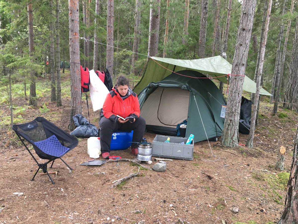 Gesagt - Getan. Wir hatten auch wieder bestes schwedischen Sommerwetter für unsere lange Tour. Zwischendurch haben wir an einer steinigen Bucht gemütlich Pause gemacht. Kurz nach 11 Uhr sind wir am DANO 19 angekommen und uns wurde nicht zuviel versprochen. Die Insel ist ziemlich klein und besitzt auf zwei Seiten wunderschöne Sandstrände. Es waren noch ein paar andere Mit-Urlauber hier die gerade am zusammenpacken waren. So konnten wir später in die Schutzhütte aus Holz als unser Tages - Nachtlager aufschlagen. Da wir schon um die Mittagszeit angekommen waren hatten wir für allerlei Dingt noch genügend Zeit. Sei es eine Inselerkundung oder das gemütliche Buch lesen in der Hängematte an den hohen Steilklippen der Insel.