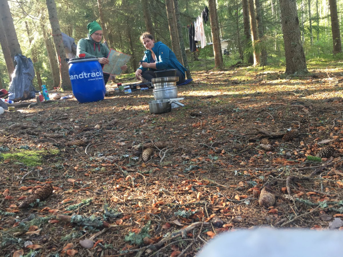 Dort angekommen haben wir uns mit Tee und Hot Dog gestärkt bevor wir ein Stück durch den Wald gelaufen sind um unsere Ausrüstung in Empfang zu nehmen. Dann hieß es umpacken, Zelt aufbauen und den Inhalt der grauen Ausstattungskiste unter die Lupe nehmen.