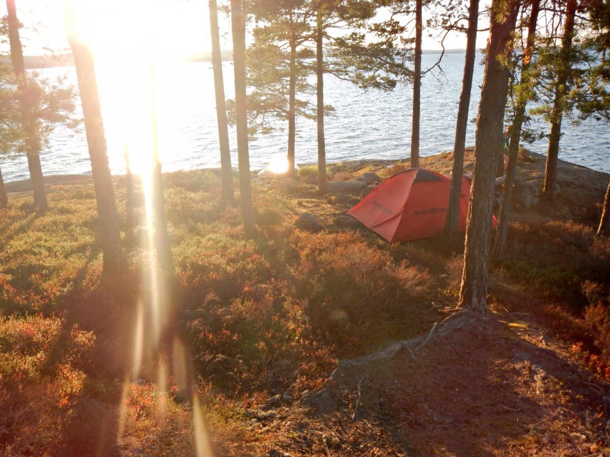 Ebenso traumhaft waren die abendlichen Plätze. Wir orientierten uns mit Kompass immer Richtung Sonnenuntergang. Unsere Plätze waren z.B. eine kleine Insel, am Rande eines ruhigen Sees, am Sandstrand (ohne Zelt), an Spitzen von Halbinseln oder zwischen Bäumen.