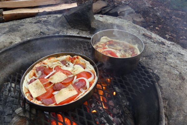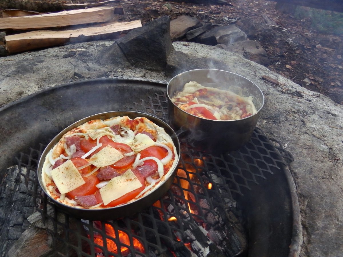 Und so machten sie sich im Anschluss darauf weiter in Richtung Norden auf. Sie hielten kurz an den Hütten 78 (Bienenalarm) und 79 (unschön) an, bis sie schließlich den perfekten Rastplatz für sich entdeckten, nämlich Rastplatz 80! Sie hatten diesen wiederum für sich alleine und er beinhaltete sogar mehrere Feuerstellen. Routinemäßig packten sie aus, sägten und spalteten circa ein Stündchen und machten hinterher Feuer. Ihr kulinarisches Ziel für diesen Abend sollte Pizza sein. Nach einigen misslungenen Versuchen schafften sie es endlich einen knusprigen Teig mit Tomaten, Salami und geschmolzenem Käse zu präsentieren. Es schmeckte vorzüglich! Der Trick bei dem Ganzen war die Pizza nur über der Glut und nicht wie sie fälschlich angenommen haben über der Flamme zu backen. Hört! Hört!