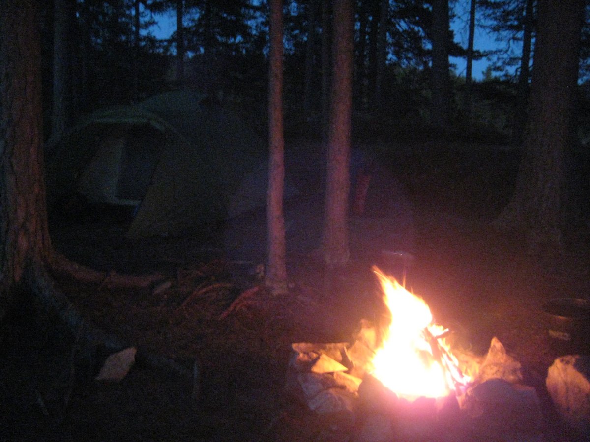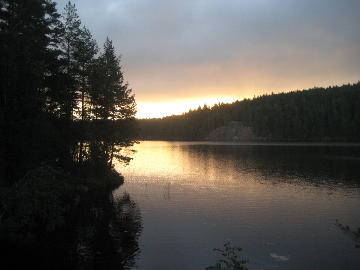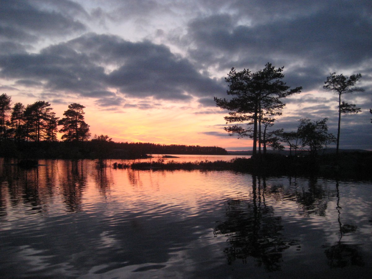 Nach dem Aufstehen kommen wir sehr schnell wieder in unsere Urlaubsroutine. Raus aus dem Zelt, Kaffeewasser aufstellen und erst mal ins Wasser springen. So erfrischt schmeckt das Frühstück gleich doppelt so gut. Wir packen zusammen und sind auch bald schon wieder auf dem Wasser. Wir fahren weiter entlang des Ufers in Richtung Süden bis Rämana zur ersten Umtrage unserer Tour. Nach zehn Minuten Fußmarsch fahren wir einige Hundert Meter durch den Glatjärnen, einen kleinen See und dann geht es schon wieder an Land, um nach wenigen Minuten auch schon wieder an den nächsten See, den Kvarnsich zu gelangen. Auch diesen queren wir und nach einer letzten kurzen Umtrage erreichen wir den letzten See des Tages, den I Rammingen, auf dem wir nach kurzer Suche wieder auf einer Insel eine Stelle für das Nachtlager finden. Wäscheleine, Kaffee, Baden, häuslich einrichten und schon ist es wieder Zeit für das Abendessen. Bei den zahlreichen Umtragen haben wir einige Pfifferlinge gefunden. Diese gibt es nun ganz frisch. Nach einem kurzen Sonnenuntergang knapp unter der Wolkendecke ist der Tag auch bald schon wieder zu Ende.