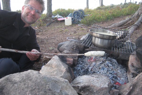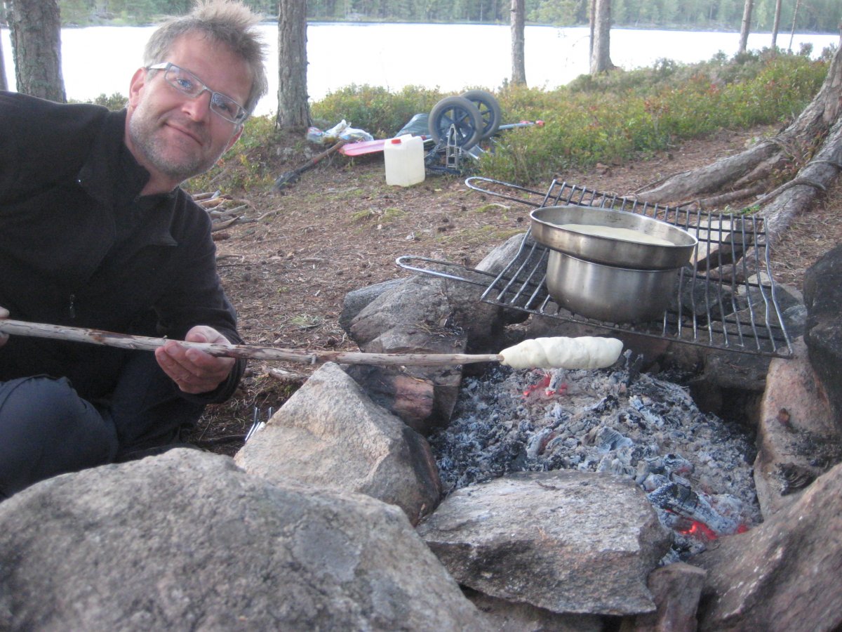 Der nächste Morgen beginnt, wer hätte es gedacht, mit Kaffeewasser aufsetzen, baden, Kaffee und Frühstück genießen. Danach geht es wieder weiter gen Norden. Die nächste Umtrage hat es in sich. Sie ist kurz aber es geht auf dieser Strecke über Wurzeln und Steine einige Höhenmeter hinab, bis wir an das Ufer des Glaäkern gelangen. Auch dieser liegt außerhalb des Naturschutzgebietes und da wir nochmals Abendessen über dem Feuer machen möchten schauen wir uns diesen kleinen See mit den zahlreichen Inseln sehr ausführlich an. Teilweise bestehen die Inseln aus Moor, dia auf der Wasseroberfläche treiben. An einem frisch gerodeten Waldstück gehen wir kurz an Land, um Kleinholz für das Abendessen zu holen. Danach springen wir nochmals ins Wasser und gönnen uns mit der schönen Aussicht einen Kaffee. Auf der nächsten Insel finden wir auch schon wieder eine schöne Stelle zum Übernachten. Heute haben wir keine Pilze gefunden. Daher probieren wir Würstchen im Stockbrotteig über dem Feuer. Das klappt überraschend gut und ist auch noch sehr lecker.