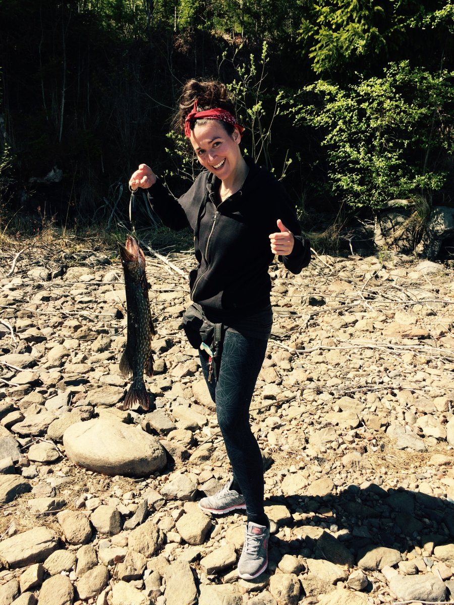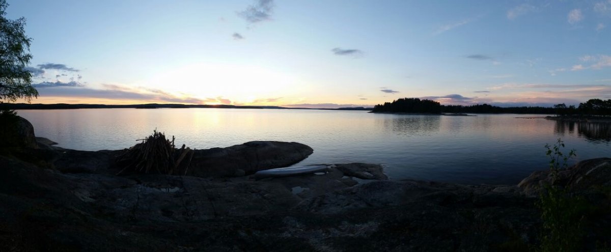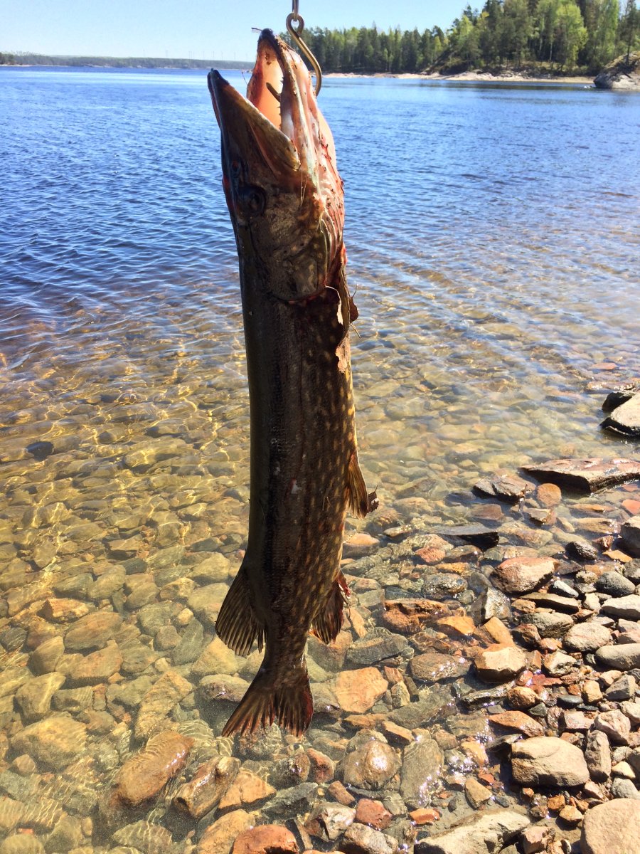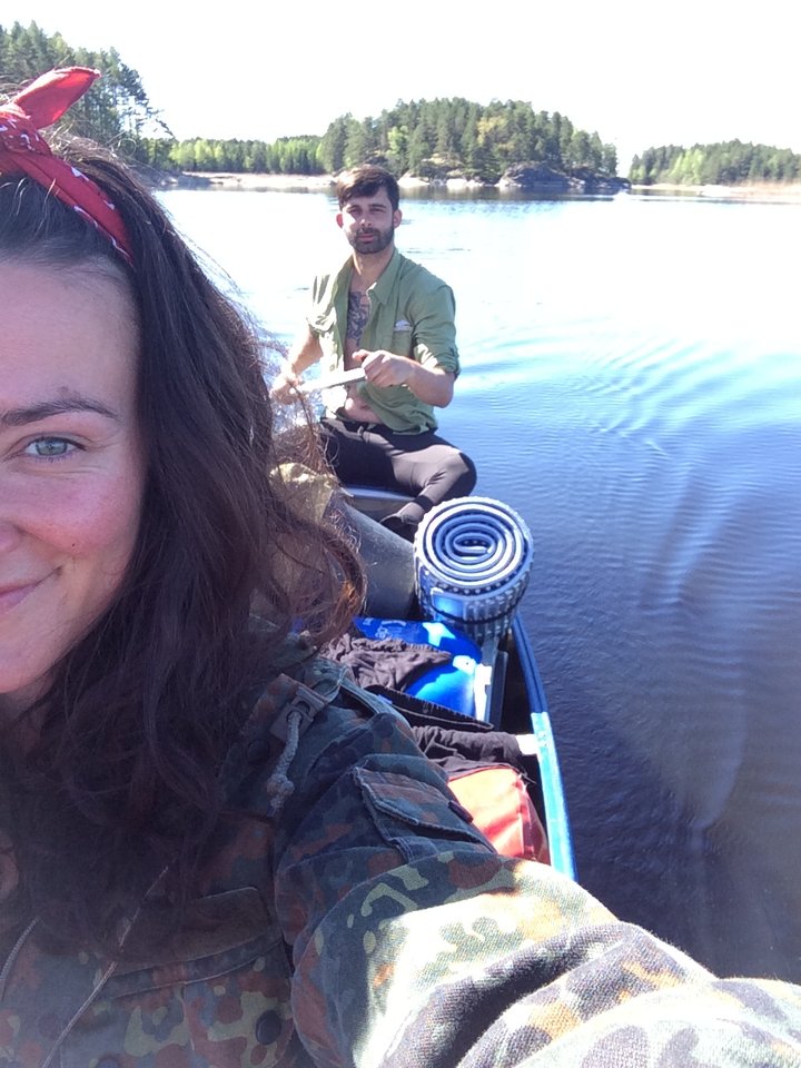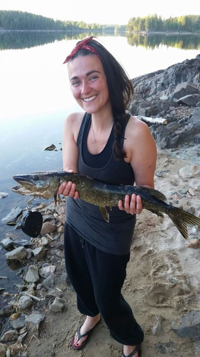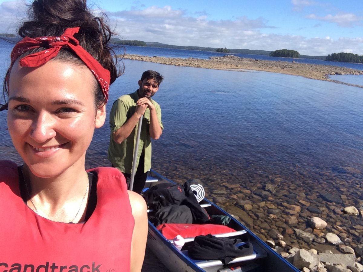 Die folgenden Tage sollten immer nach dem gleichen Schema ablaufen: Nach dem Aufstehen machten wir das Feuer an, um uns einen Kaffee oder Tee zu kochen. Da wir beide keine Armbanduhren tragen und unsere Handyakkus schonen wollten, hatten wir keine Vorstellung davon, wie spät es eigentlich war. Da wir uns recht nördlich befanden, dämmert es erst gegen 23 Uhr, die Sonne ging allerdings bereits gegen 04.30 Uhr wieder auf. Nachdem wir unsere Schlafsäcke an die Wäscheleine zum Lüften hängten, besprachen wir bei Müsli und Nutellabrot (ja, es gibt Nutella ;)), die jeweilige Tagesroute. Nach kurzer Katzenwäsche und Toilettengang packten wir unser gesamtes Hab und Gut zusammen und machten uns auf den Weg zum nächsten Ziel. Meist versuchten wir einen Kanuschlafplatz zu finden, an dem wir alleine waren und mussten dafür auch ab und zu einen Umweg in Kauf nehmen. Unsere Arme und Schultern spürten diese Extrakilometer immer als erstes und so wechselten sich die Langstrecken - und Faulenztage fair miteinander ab. Bei jeder Gelegenheit hielten wir die Angeln ins Wasser und wurden schließlich an unserem dritten Tag endlich belohnt - Flo zog nämlich direkt beim ersten Wurf einen zwei Kilo Hecht aus dem Wasser, der anschließend abends von uns (diesmal ohne Hilfe des Kochbuchs) köstlich zubereitet wurde. Damit es keinen Streit gibt, schickte mir die Unterwasserwelt bereits am nächsten Tag ebenfalls einen Hecht vorbei. Man munkelt zwar, dass er nicht ganz zwei Kilo gehabt haben soll aber was soll´s :). Petri Heil!