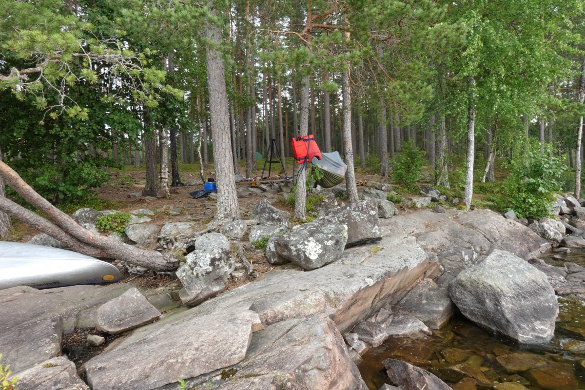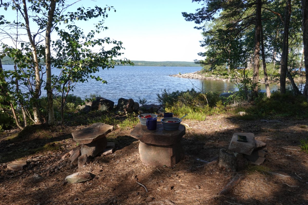 Als wir aufwachten hat es bereits geregnet. Nun waren wir froh am Vorabend unseren inneren Schweinehund besiegt und alles beiseite geräumt zu haben. Bei dem Schmuddelwetter wollten wir etwas Warmes zum Frühstück. Also gab es Porridge mit Bananenscheiben und Nutella.Den Rest vom Tag war es so windig, dass wir nicht aufs Kanu konnten und stattdessen den aktuellen Platz etwas optimiert haben. Mit dem Tarp haben wir uns einen Windschutz gebaut und direkt dahinter aus Steinen zwei Sitze und einen Tisch gebaut. Danach sind wir noch Beeren fürs Frühstück sammeln gegangen (wenn ihr weiter in den Wald lauft, findet ihr auch Himbeerbüsche).